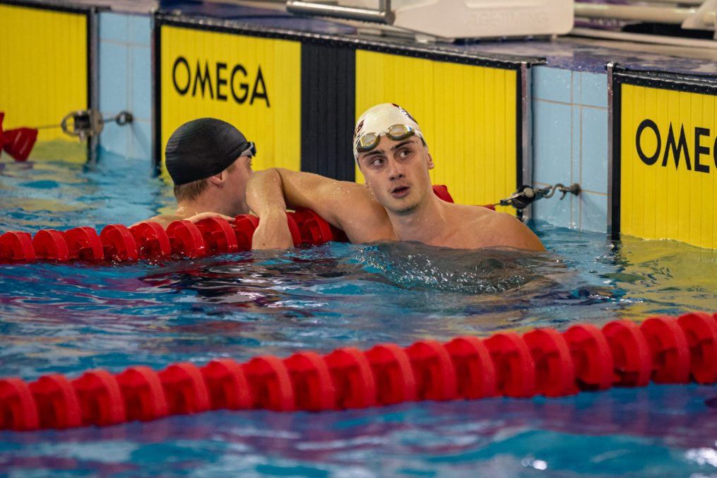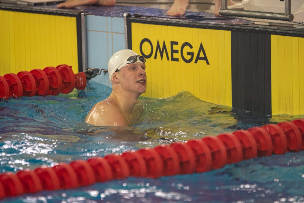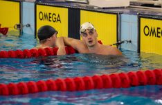 Peldētājs Nikolass Deičmans ar savu treneri Astru Ozoliņu.