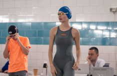 Peldētāja Kristīne Zinoviča ar mammu.