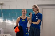 Peldētāja Kristīne Zinoviča ar savu treneri Ingu Arnīti-Puikevicu.