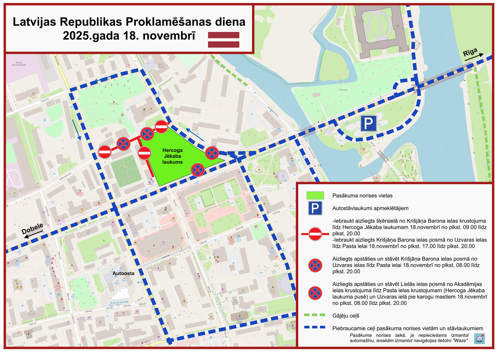 18. novembrī Hercoga Jēkaba laukumā pulksten 18 notiks svētku koncerts “Sapnis par Latviju”. Iedzīvotājiem jārēķinās, ka Hercoga Jēkaba laukuma apkārtnē otrdien jau no rīta būs noteikti satiksmes ierobežojumi, bet no pulksten 17 līdz 20 – slēgts Krišjāņa Barona ielas posms no Uzvaras līdz Pasta ielai.