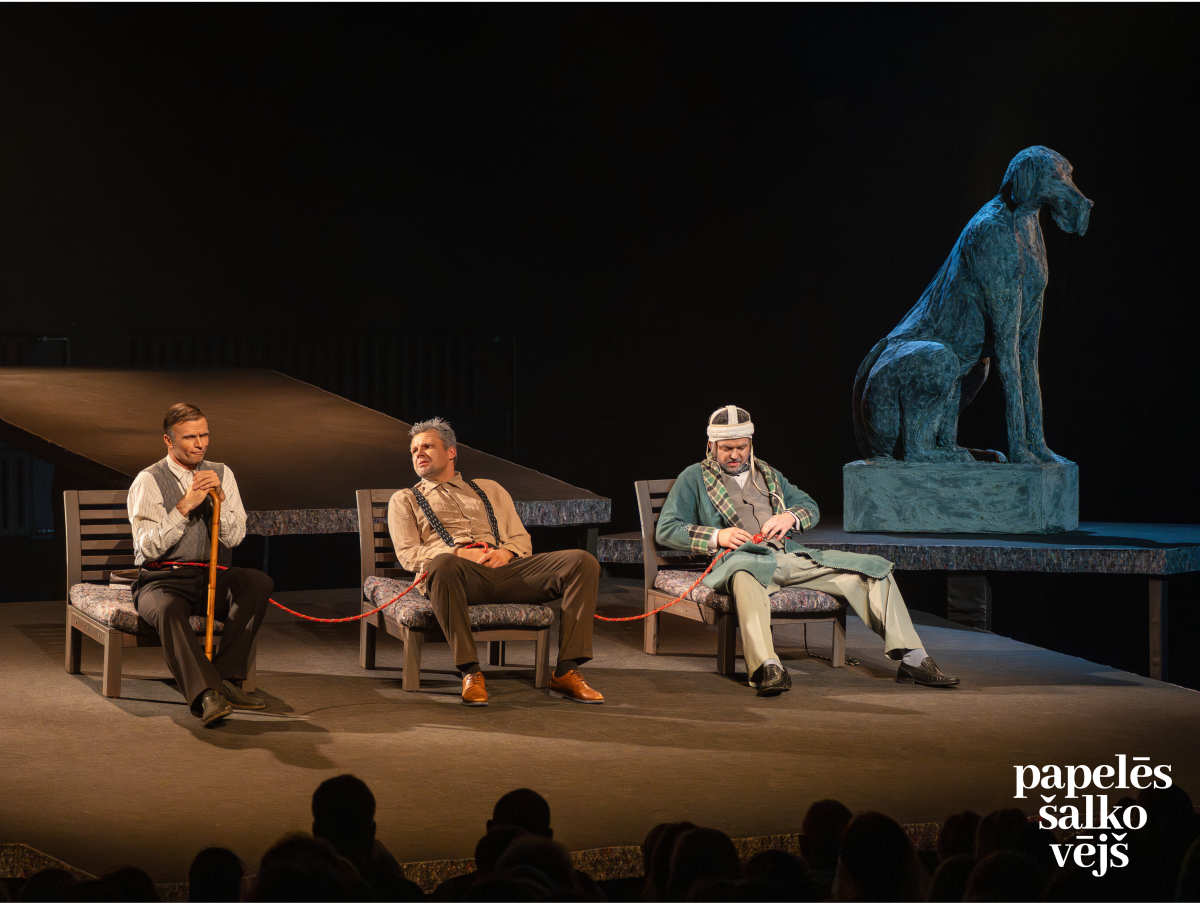 Žeralda Sibleira “Papelēs šalko vējš” – paskumja komēdija. Viņi ir trīs vīri – virtuozi sarunu biedri, varbūt pat draugi, likteņa brāļi. Ir vēl ceturtais – suns. Tikšanās vieta un laiks nemainīgs – viena vakara stunda uz terases, no kuras paveras skats, kādu neviens cits nav pelnījis. Un tieši tas kādu dienu maina visu. Lomās: Renē – Jānis Dūrējs, Gistavs – Roberts Avots un Fernāns – Ansis Griķis.