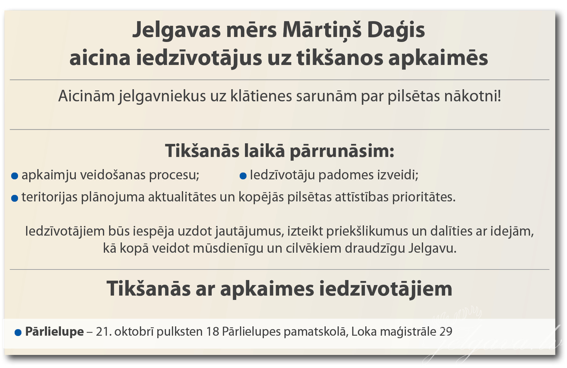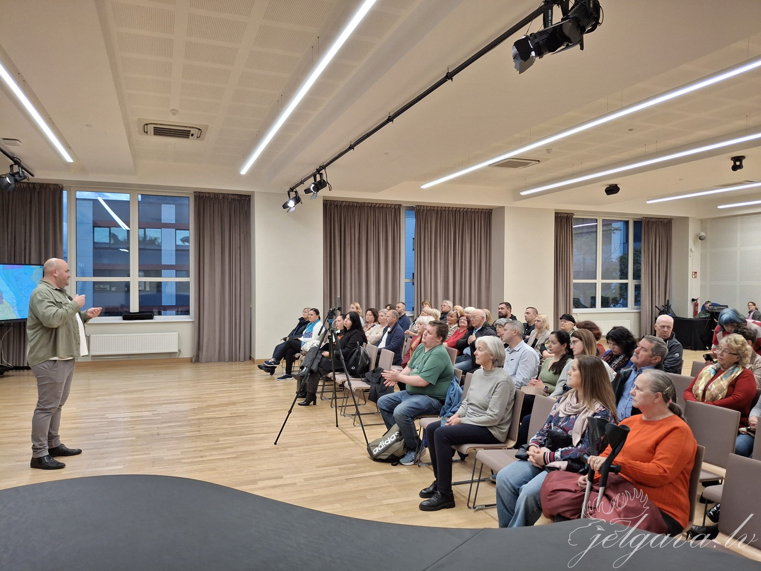 Jelgavas Tehnoloģiju vidusskolā 17. oktobrī vairāk nekā 60 Satiksmes ielas-Meiju ceļa apkaimes iedzīvotāji tikās ar Jelgavas domes priekšsēdētāju Mārtiņu Daģi, lai pārrunātu viņus interesējošos jautājumus.