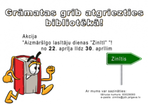 Līdz 30. aprīlim bērnu bibliotēka „Zinītis” atzīmē Bibliotēku nedēļu, kuras tēma ir “Informēts un vesels”. Bibliotēku nedēļas ietvaros paredzētas “Aizmāršīgo lasītāju dienas”, kad ikviens lasītājs aicināts pārskatīt grāmatplauktus. Ja tajos ir palikusi kāda grāmata, tad šī ir iespēja to atnest uz bibliotēku – līdz aprīļa beigām netiks iekasēta kavējuma nauda par laikus nenodotiem bibliotēkas iespieddarbiem.