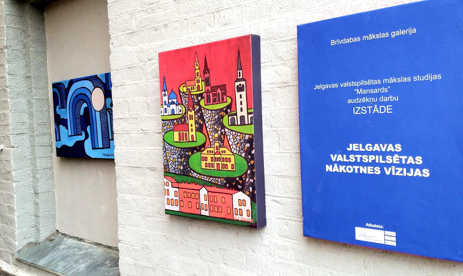 “Mansarda”Mākslas un dizaina nodaļā mācās 10 līdz 16 gadu veci jaunieši. Izstādē “Jelgavas valstspilsētas nākotnes vīzijas”ir apskatāmi 30 darbi – katram audzēknim viens. Lai košos un stilistiski daudzveidīgos oriģināldarbus nevarētu sabojāt mainīgie laika apstākļi, tie ir pārfotografēti un eksponēšanai brīvdabā izdrukāti orģinālajā lielumā.