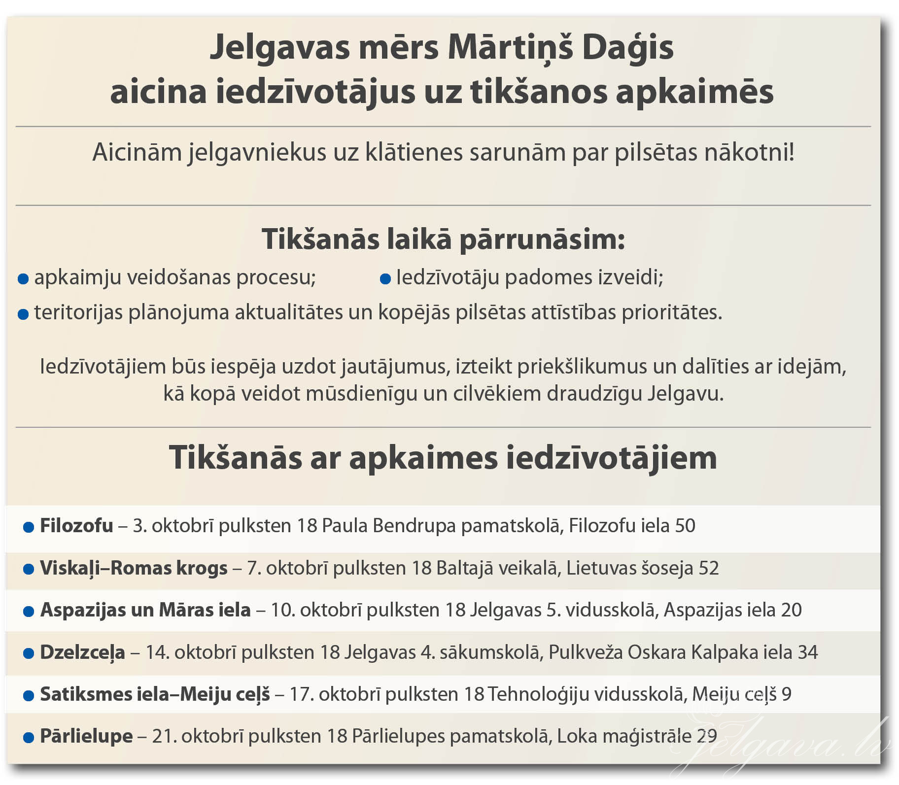 Atgādinām, ka iedzīvotāji līdz 2025. gada  31. oktobrim var iesniegt savus priekšlikumus par Jelgavas apkaimju robežām un nosaukumu idejām.