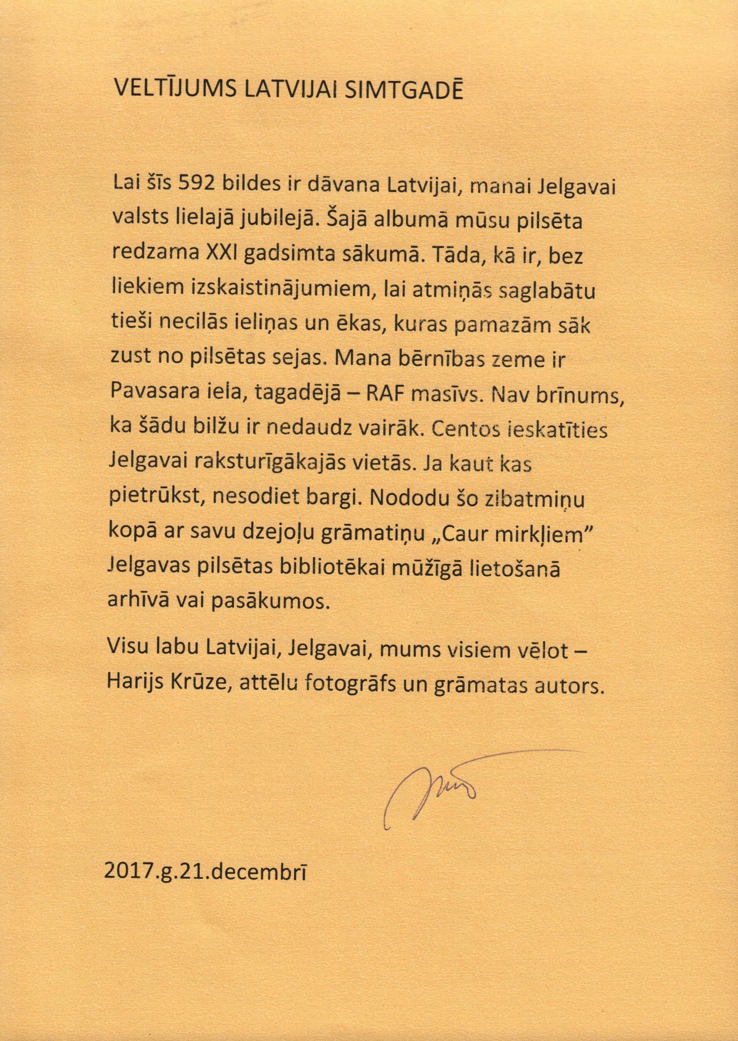 Jelgavas pilsētas bibliotēka gada izskaņā ir saņēmusi nenovērtējamu dāvinājumu – Harija Krūzes fototgrāfijās iemūžinātu 21. gadsimta sākuma Jelgavu. Dzejnieks Harijs Krūze nodevis bibliotēkas glabāšanā un ikviena interesenta rīcībā savu fotogrāfiju digitālās versijas – 592 attēlus ar mūsdienu Jelgavu. Kolekcija ir unikāla laikmeta liecība, mūsu atmiņu glabātāja, tilts no šodienas uz rītdienu. Jelgavas seja bez izskaistinājumiem un noklusējumiem.