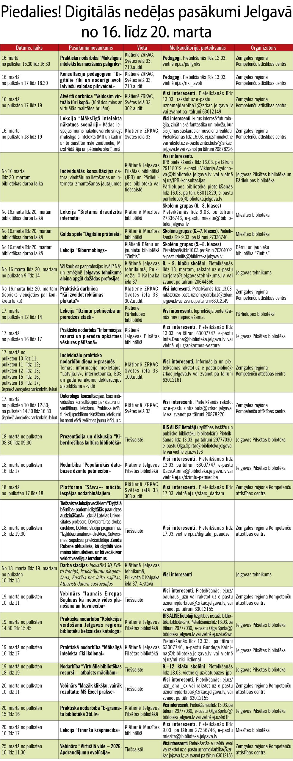Digitālā nedēļa Latvijā notiek Eiropas kampaņas “ALL Digital Weeks 2026” gaitā, kas šogad norisināsies no 9. līdz 25. martam, aicinot sabiedrību piedalīties dažādos konkursos, izmēģināt digitālo prasmju pašnovērtēšanas testus, kā arī pievienoties tiešsaistes pasākumiem. Jelgavā Digitālās nedēļas pasākumu norisi koordinē Zemgales reģiona Kompetenču attīstības centrs (ZRKAC), kas sadarbībā ar Jelgavas tehnikumu, Jelgavas Pilsētas bibliotēku un tās filiālēm sagatavojis plašu piedāvājumu. No 16. līdz 20. martam Jelgavas Digitālās nedēļas plānā iekļauti kopumā 27 pasākumi – lekcijas, semināri, individuālās konsultācijas, praktiskās darbnīcas, darba stacijas un galda spēle.