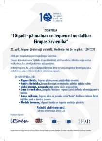 23.aprīlī no pulksten 11 līdz 12.30 Jelgavas Zinātniskajā bibliotēkā norisināsies diskusija par desmit Eiropas Savienībā pavadītajiem gadiem. Diskusijas laikā klātesošie pārrunās to, kā Latvijas un tās iedzīvotāju dzīve ir mainījusies, kā arī par nākotnes prognozēm.