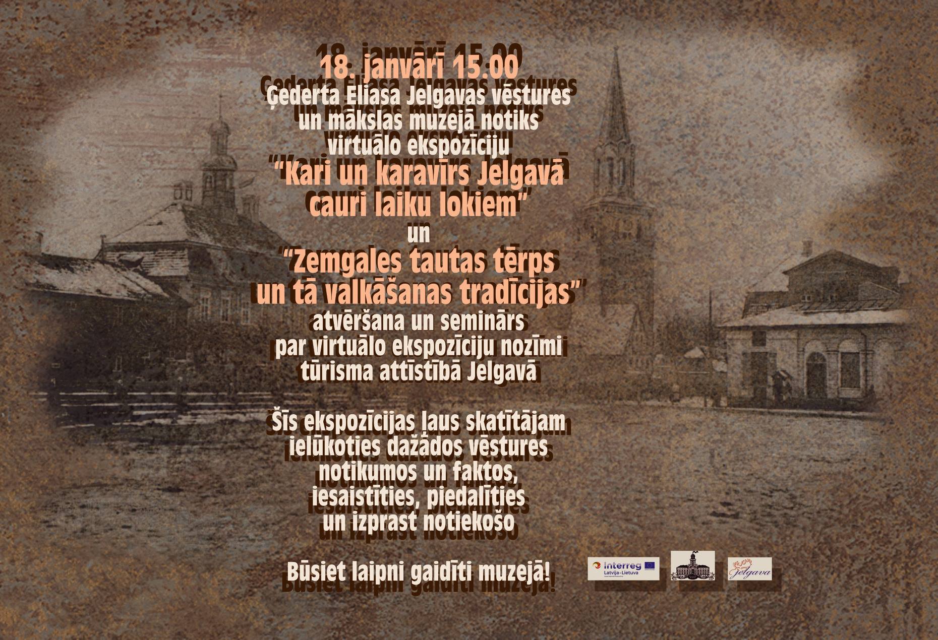 Šo piektdien, 18.janvārī, pulksten 15.00 atklāsim jaunās virtuālās ekspozīcijas, kas ļaus pašu acīm redzēt Jelgavu cauri dažādiem vēstures posmiem. “Kari un karavīri cauri Jelgavas laiku lokiem” ļaus ceļot laikā un būt lieciniekiem zemgaļa bēgšanai no Livonijas ordeņa brāļu gūsta, vai staigāt pa Jelgavas tirgus laukumu 20.gs. sākumā. Savukārt, “Zemgales tautas tērps un tā valkāšanas tradīcijas” ļaus piedalīties zemgaļu kāzās un noaust līgavai svārkus.