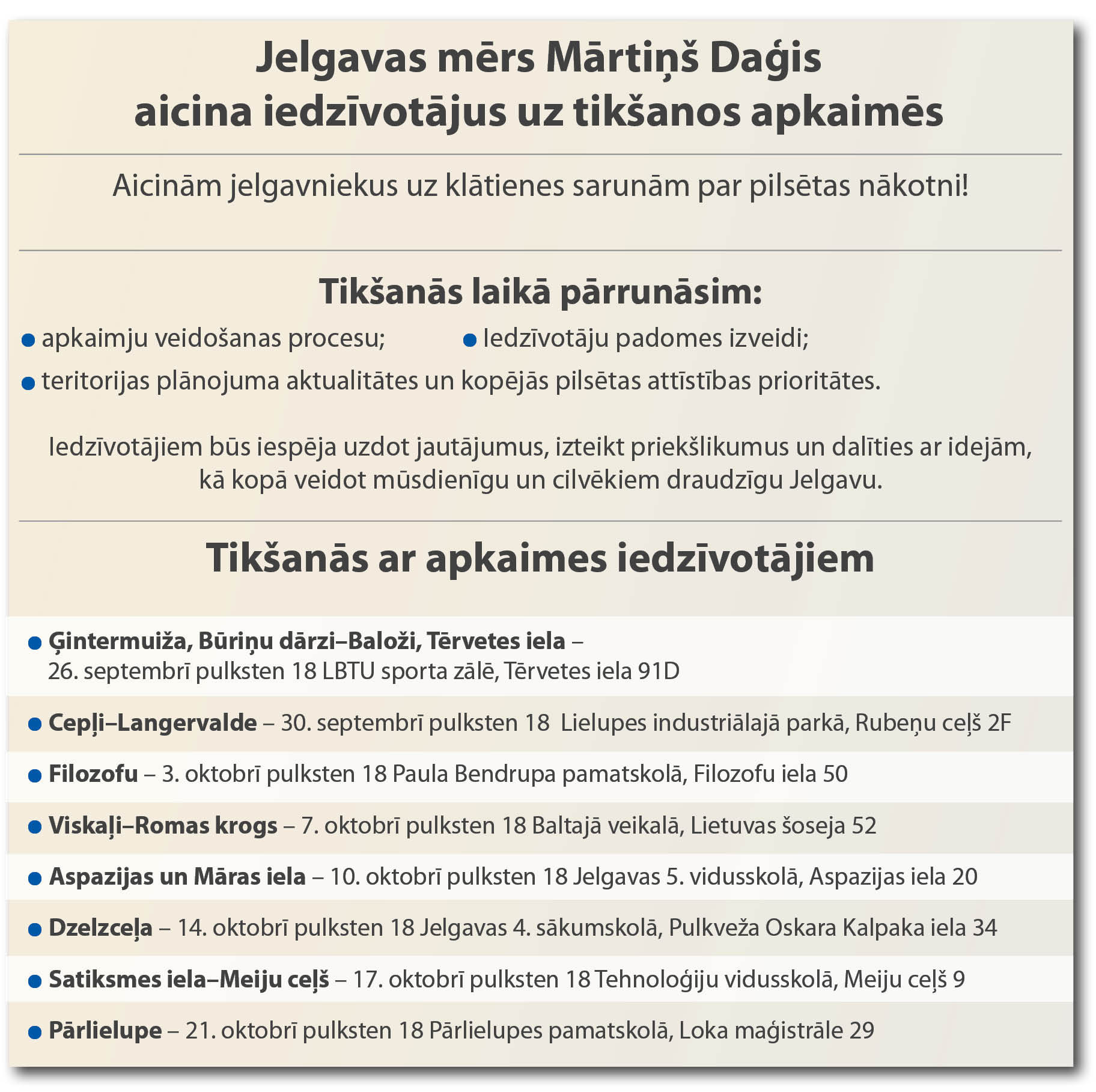 Nākamā tikšanās jau piektdien, 26. septembrī, pulksten 18 Latvijas Biozinātņu un tehnoloģiju universitātes sporta zālē, Tērvetes ielā 91D, uz tikšanos ar Jelgavas pilsētas mēru Mārtiņu Daģi gaidīti Ģintermuižas, Būriņu dārzi – Baloži, Tērvetes iela apkaimes iedzīvotāji, lai runātu par pilsētas nākotni.