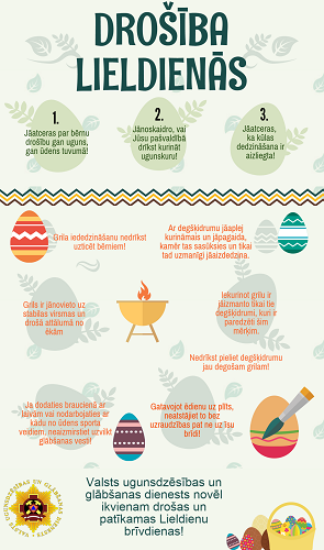 Meteorologu prognozes liecina, ka Lieldienās Latvijā laiks būs saulains un sauss. VUGD iepriekšējo gadu pieredze liecina, ka iedzīvotāji šādos laikapstākļos dodas atpūtā pie dabas, tāpēc sevišķa uzmanība jāpievērš ugunsdrošībai, lai neizceltos kūlas ugunsgrēks.