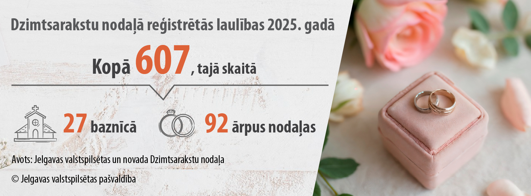 Sākumlapa JaunumiĢimeneDzimtsarakstu nodaļā 2025. gadā laulību reģistrējuši 607 pāri
