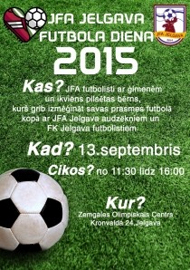 13.septembrī visā Latvijā notiks “Futbola diena 2015”. Arī jelgavnieki aicināti uz Zemgales Olimpisko centru, lai no pulksten 11.30 kopā ar Jelgavas Futbola Akadēmiju svinētu futbola svētkus.
