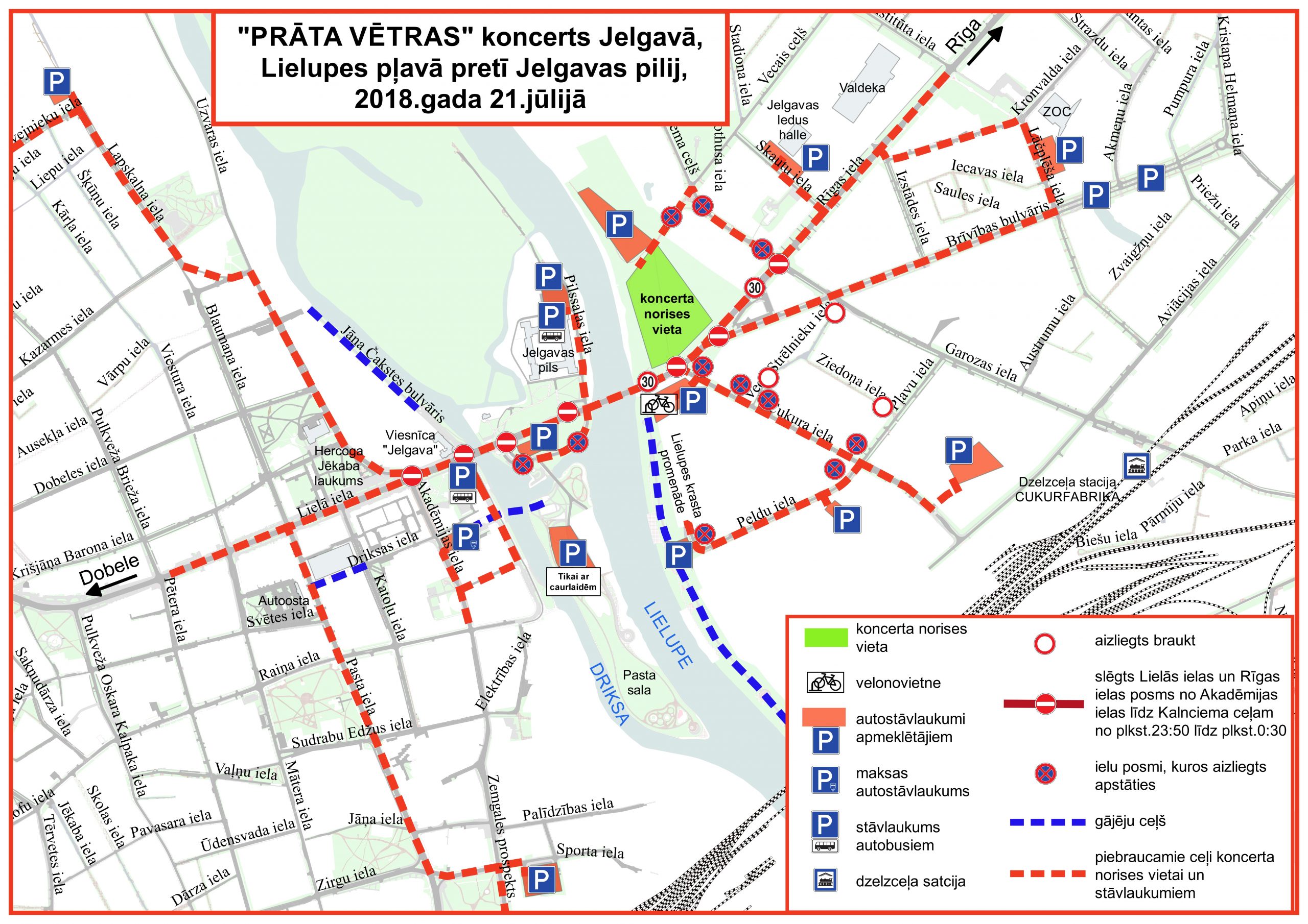 Ņemot vērā, ka koncertu apmeklēs vairāk nekā 20 000 cilvēku, aicinām savlaicīgi iepazīties ar satiksmes shēmu. Īsi pirms un pēc pasākuma paredzama ievērojama apmeklētāju plūsma. Tie, kuri tomēr izvēlēsies koncertu apmeklēt ar automašīnu, lai efektīvāk plānotu maršrutu, varēs tiešsaistē saņemt satiksmes informāciju caur navigācijas lietotni “Waze”. Visa aktuālā satiksmes informācija tiks publicēta arī Jelgavas pilsētas lapā “Facebook” un Jelgava.lv.
