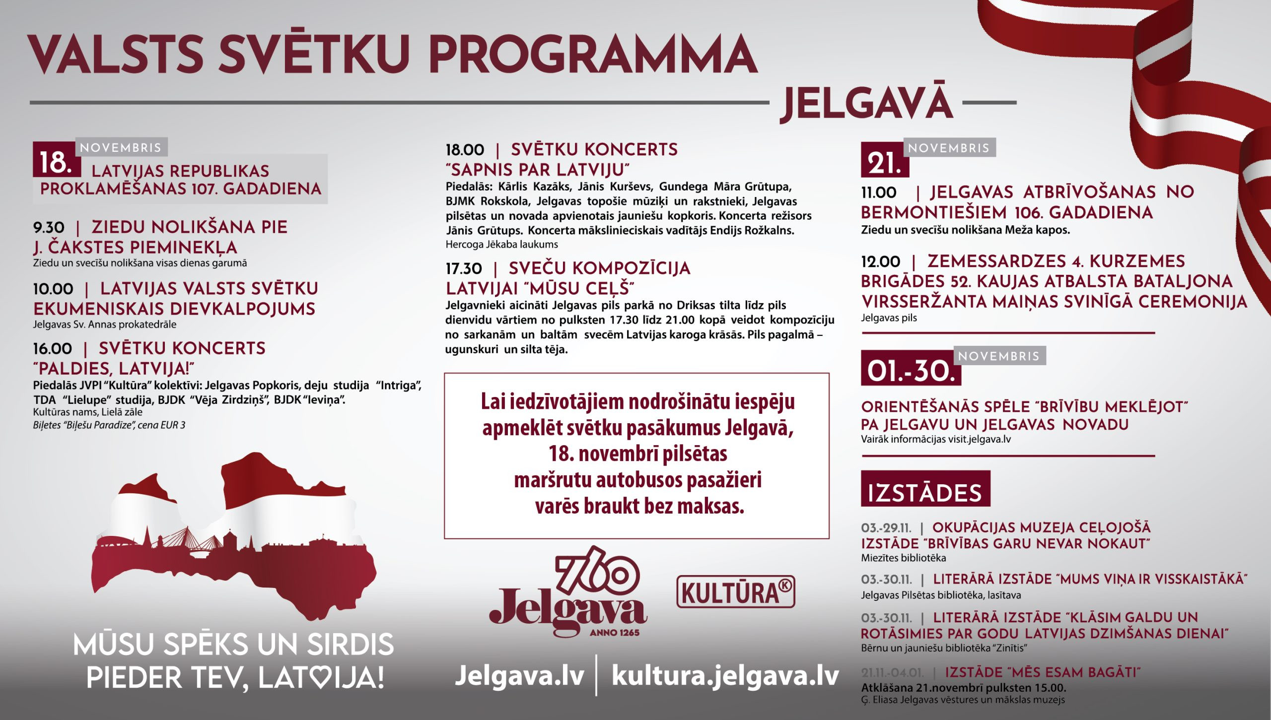 Lai iedzīvotājiem nodrošinātu iespēju apmeklēt svētku pasākumus Jelgavā, 18. novembrī pilsētas maršrutu autobusos pasažieri varēs braukt bez maksas. Jāņem gan vērā, ka autobusi kursēs pēc sestdienas saraksta. Ar autobusu kursēšanas grafiku var iepazīties Jelgavas Autobusu parka mājaslapā www.jap.lv.