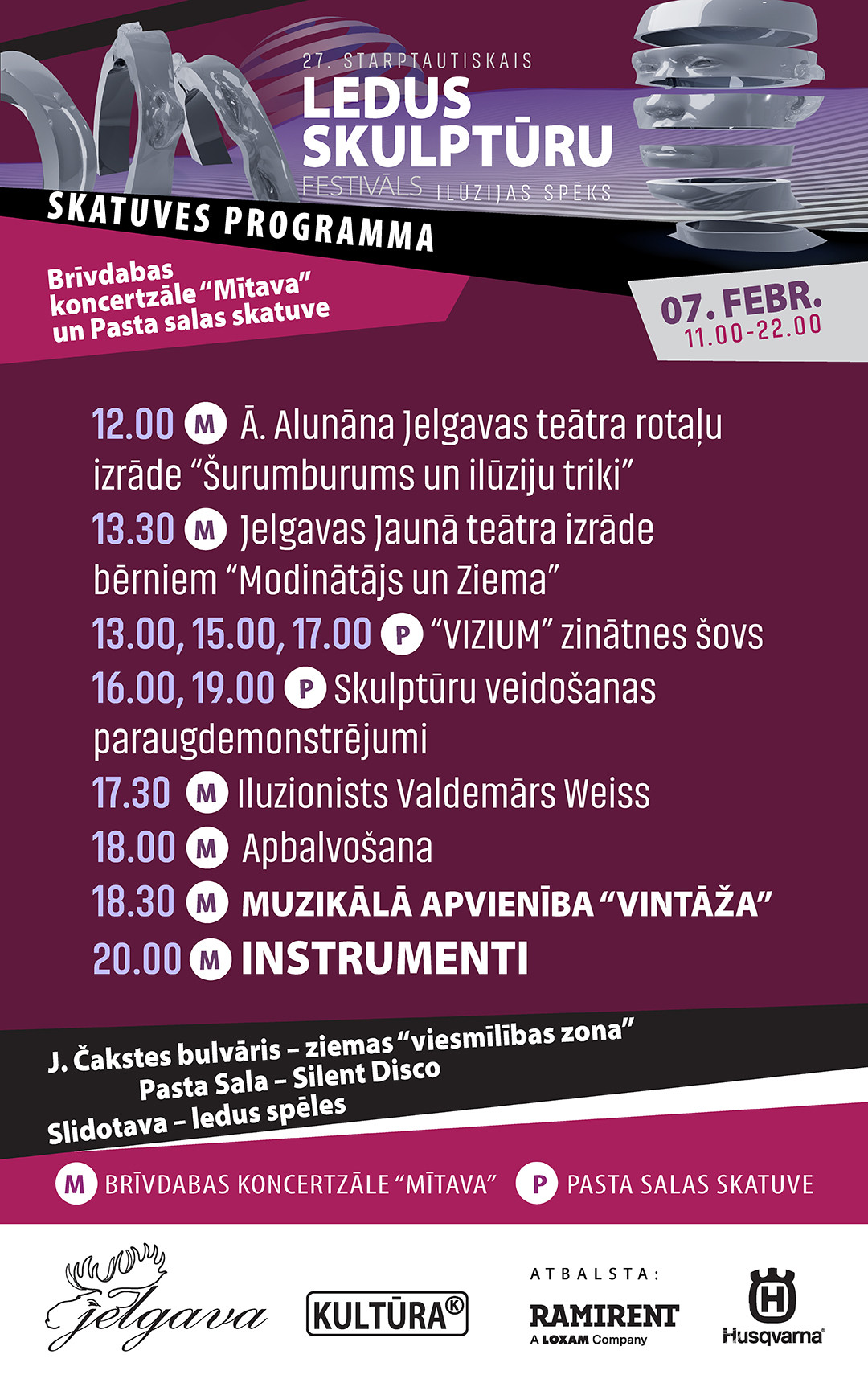 27. Starptautiskā ledus skulptūru festivāla teritorija 7. un 8. februārī būs atvērta no pulksten 11 līdz 22, aicinot apmeklētājus raudzīties tālāk par acīm redzamo un piedzīvot brīžus, kuros patiesība savijas ar maldiem. Festivālu papildinās plaša izklaides programma: skulptūru veidošanas dueļi, zinātnes šovi, iluzionistu priekšnesumi, ledus spēles un slidkalniņš, bērnu rotaļu izrādes un koncerti ar Latvijā plaši zināmiem mūziķiem.