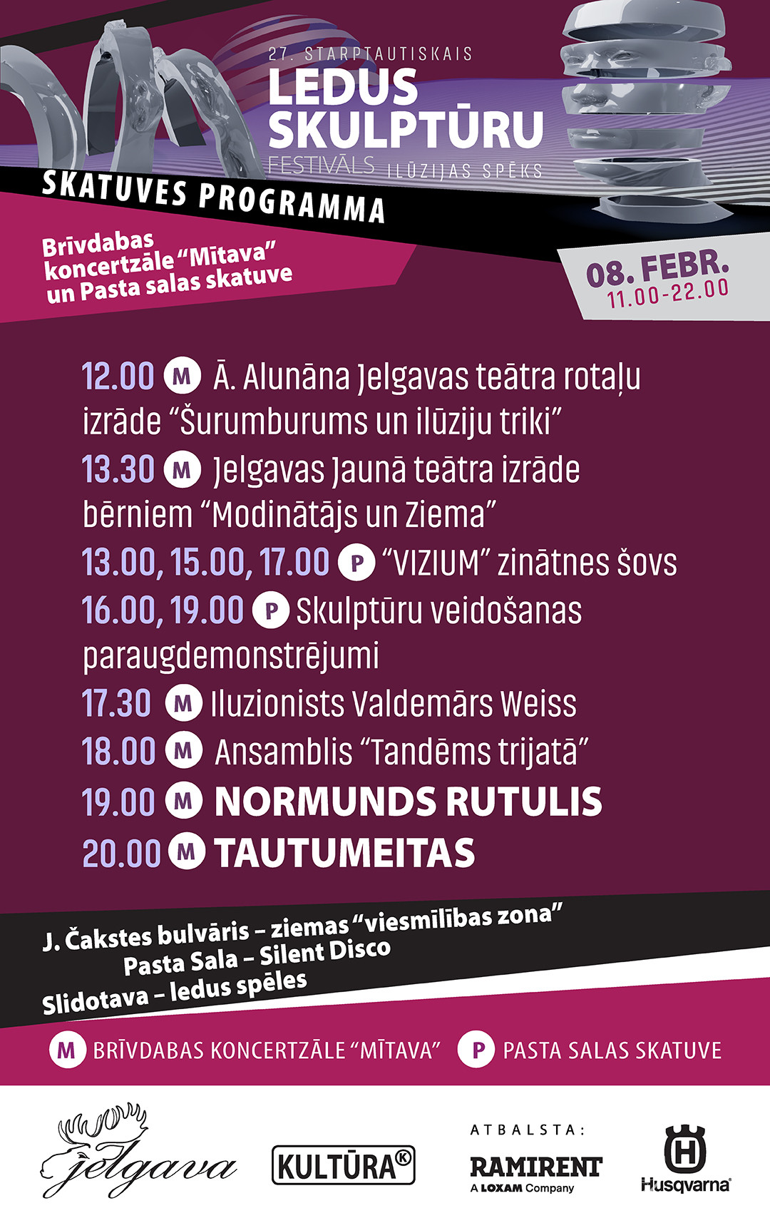 Pasta sala, brīvdabas koncertzāle “Mītava” un slidotava būs galvenās festivāla norises vietas, kur apmeklētājus gaidīs gan individuālās un komandu skulptūras, gan plaša kultūras programma uz divām skatuvēm. Savukārt Jāņa Čakstes bulvāris, kas iepriekšējos gados bija daļa no maksas teritorijas, šogad būs brīvi pieejama svētku zona. Tajā būs aplūkojamas ledus fotoskulptūras, darbosies atrakcijas un karuseļi, kā arī ziemas “viesmīlības zona” ar plašu gardumu un uzkodu klāstu, karsto un auksto dzērienu izvēli un amatnieku darinājumiem. Iestājoties tumšākam laikam, svētku atmosfēru paspilgtinās arī lāzeršovs – tas notiks ar atkārtojumiem, un būs skatāms no jebkuras vietas festivāla teritorijā.