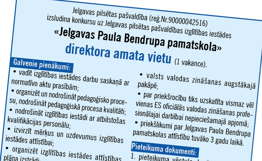 Līdz 30. jūnijam var pieteikties Jelgavas Paula Bendrupa pamatskolas, kas atrodas Filozofu ielā 50, direktora amata konkursam.