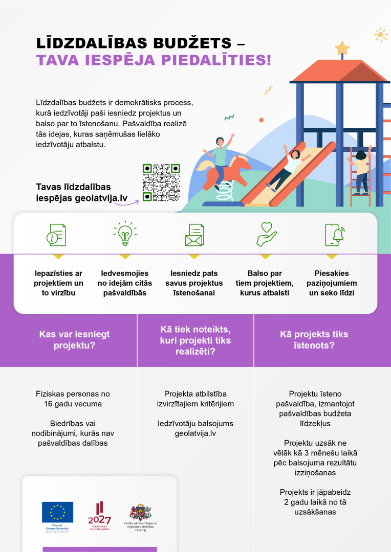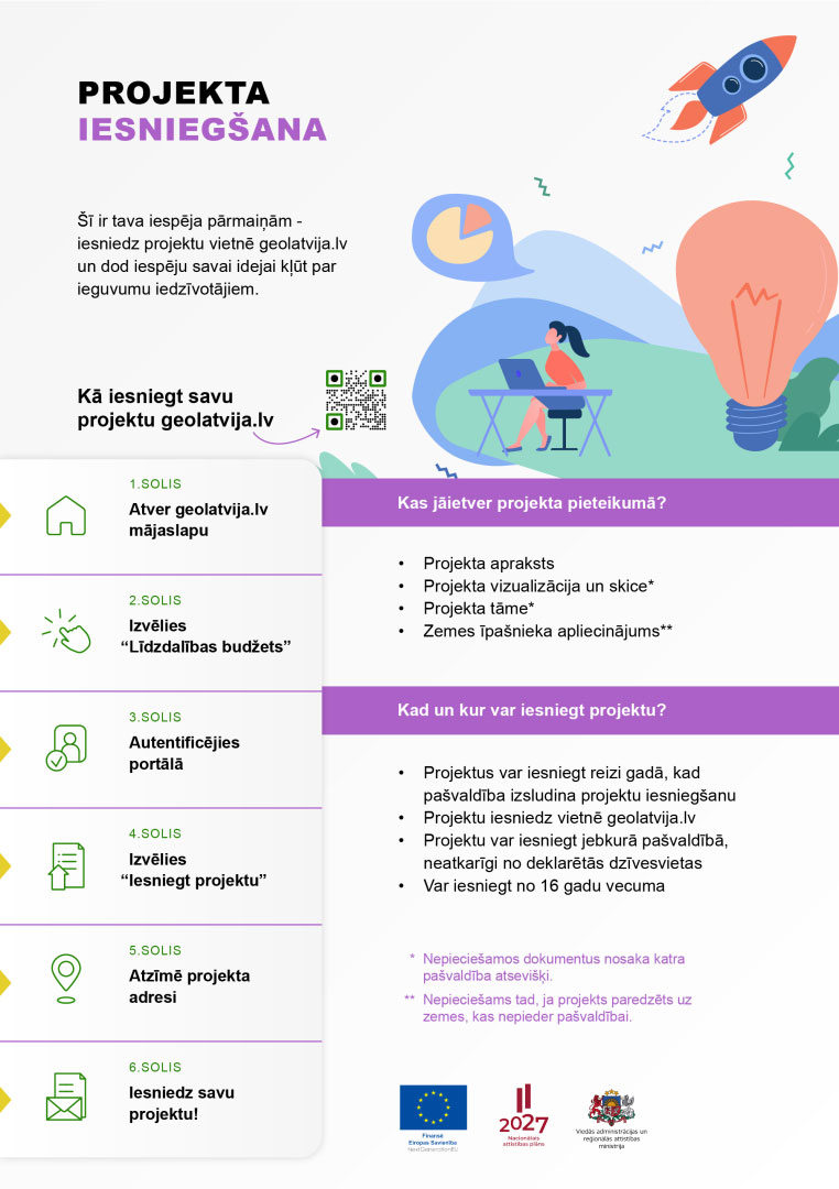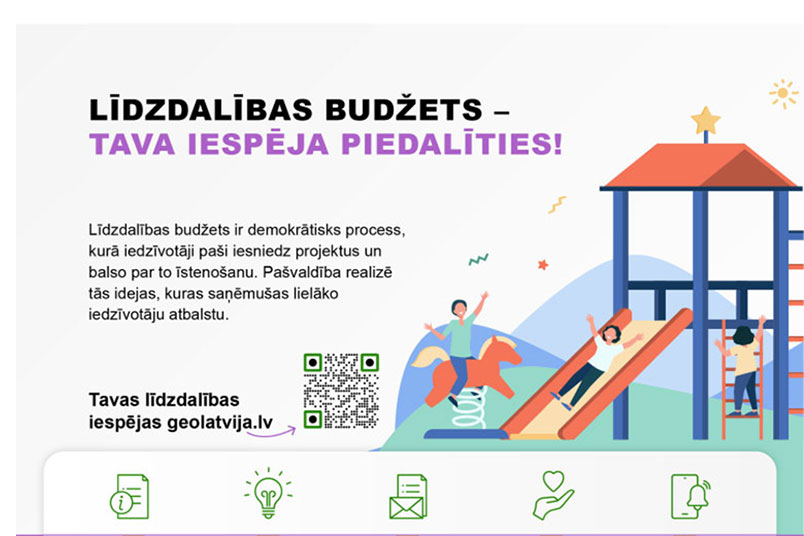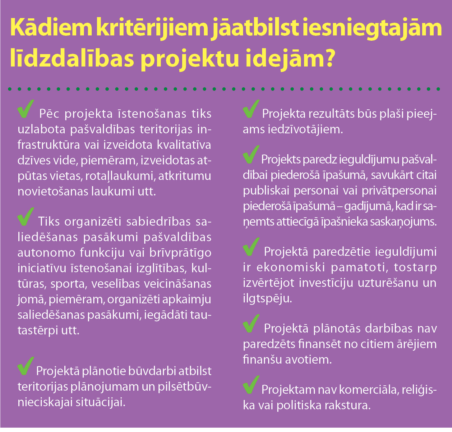 Projektu pieteikumus var iesniegt jebkura fiziska persona no 16 gadu vecuma, kā arī biedrības un nodibinājumi bez pašvaldības līdzdalības. Vienam iesniedzējam ir tiesības iesniegt neierobežotu skaitu projektu pieteikumu. Jāatgādina, ka kopš pagājušā gada projektu ideju pieteikumi ir jāiesniedz valsts vienotajā ģeotelpiskās informācijas portālā GeoLatvija.lv, sadaļā “Līdzdalības budžets”. Turpat vēlāk tiks organizēts iedzīvotāju balsojums par labākajām idejām. Lielāko atbalstu guvušās idejas realizēs pašvaldība.