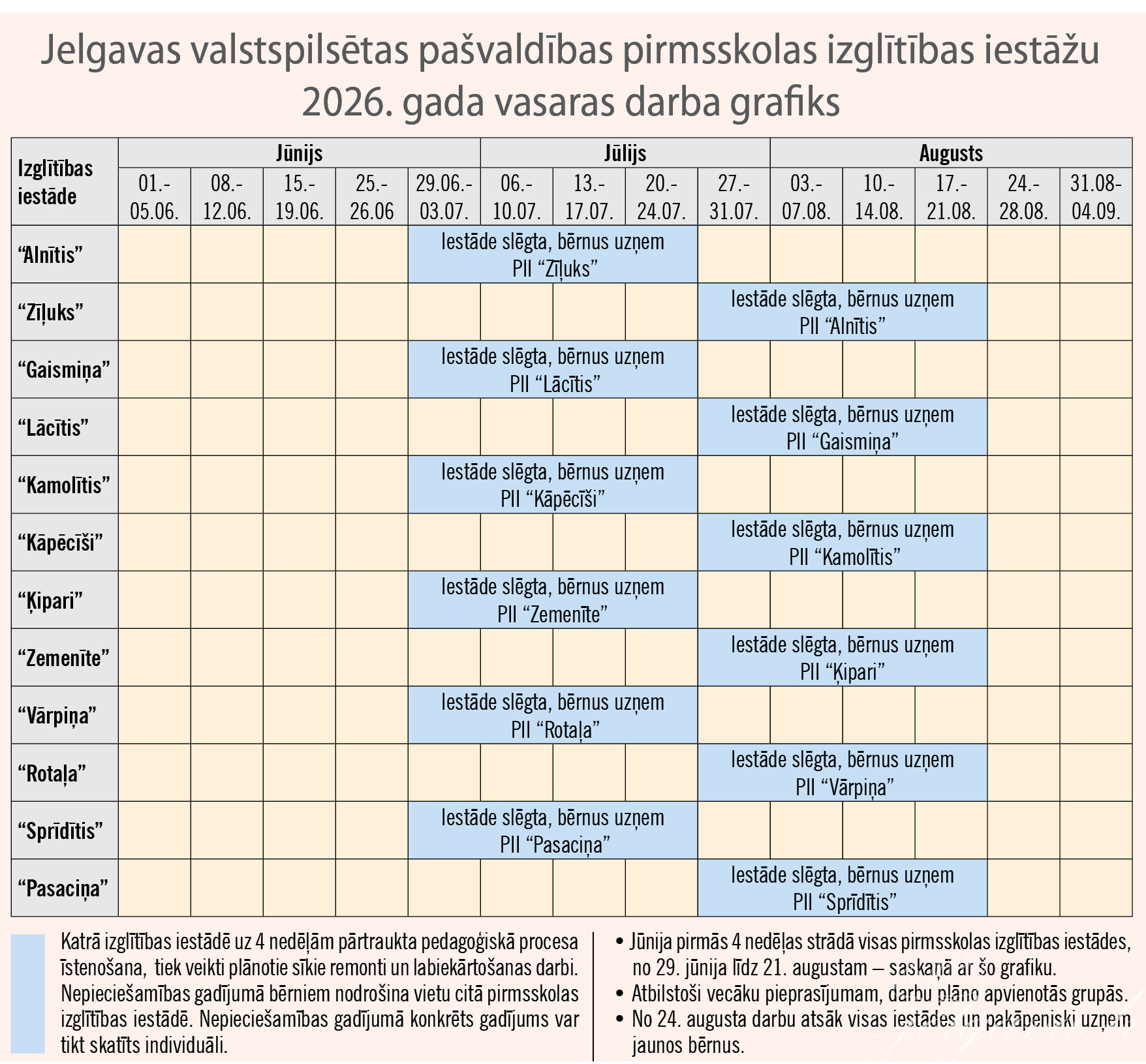 Lai nodrošinātu pirmsskolas izglītības pakalpojuma pieejamību bērniem arī vasarā, vienlaikus racionāli un atbildīgi izmantojot pašvaldības resursus, ir izstrādāts Jelgavas pašvaldības pirmsskolas izglītības iestāžu darba organizācijas grafiks 2026. gada vasaras periodam – jūnijā, jūlijā, augustā.