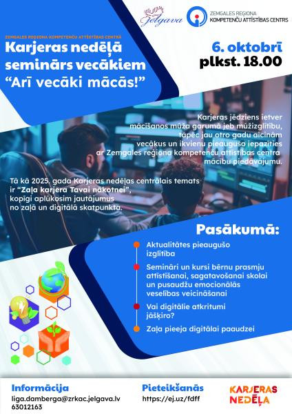 Karjeras jēdziens ietver mācīšanos visa mūža garumā, tāpēc jau otro gadu ZRKAC aicina vecākus un ikvienu pieaugušo iepazīties ar centra mācību piedāvājumu. Šogad Karjeras nedēļas centrālais temats ir “Zaļa karjera Tavai nākotnei”, tādēļ seminārā kopīgi tiks aplūkota gan zaļās, gan digitālās pieejas nozīme mācībās un ikdienas paradumos.