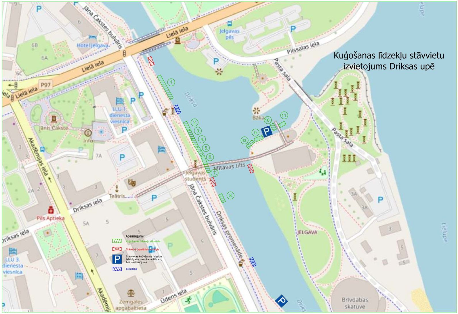 Lai paplašinātu iespējas izmantot pilsētas ūdenstilpes, izveidota jauna kuģošanas līdzekļu stāvvieta – Nr.12 pie restorāna “Pilsētas elpa”. Līdz ar to jaunajā kuģošanas sezonā būs pieejamas divas īslaicīgas pietauvošanās vietas – pie Latvijas Biozinātņu un tehnoloģiju universitātes Sporta nama un pie restorāna “Pilsētas elpa”, kur kuģošanas līdzekļus varēs pietauvot līdz četrām stundām. Bet divpadsmit stāvvietas turpmāk tiks izsolītas nomai uz ilgāku laiku – diviem gadiem.