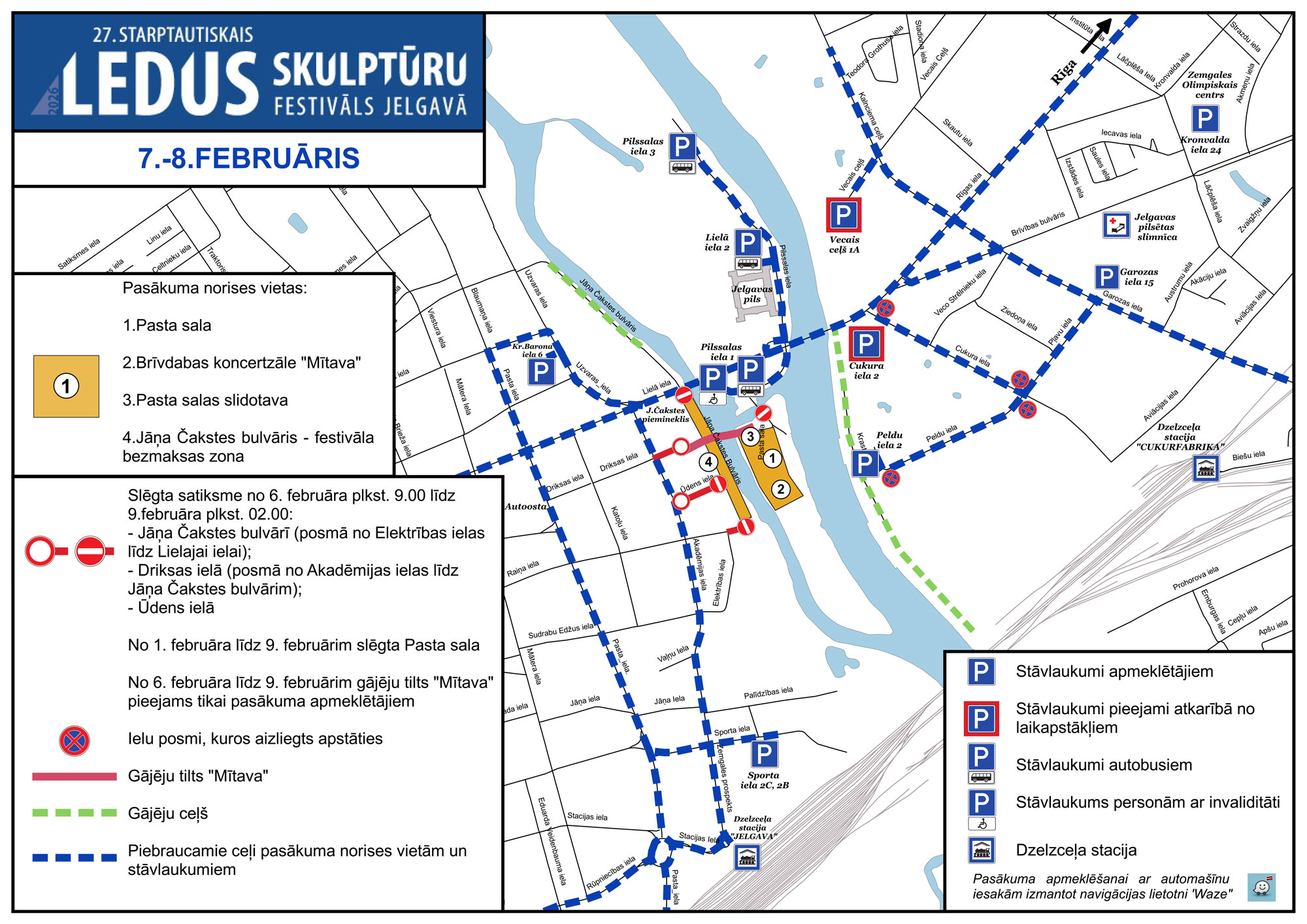 Ņem vērā! Festivāla laikā – 7. un 8. februārī – pilsētā iespējama paaugstināta satiksmes intensitāte. Jelgavas pašvaldība festivāla laikā sadarbosies ar navigācijas lietotni “Waze”, kurā ikvienam būs pieejama karte ar iezīmētiem stāvlaukumiem un satiksmes ierobežojumiem. Autovadītāji tiešsaistē reāllaikā varēs saņemt satiksmes informāciju, kas palīdzēs plānot maršrutu.