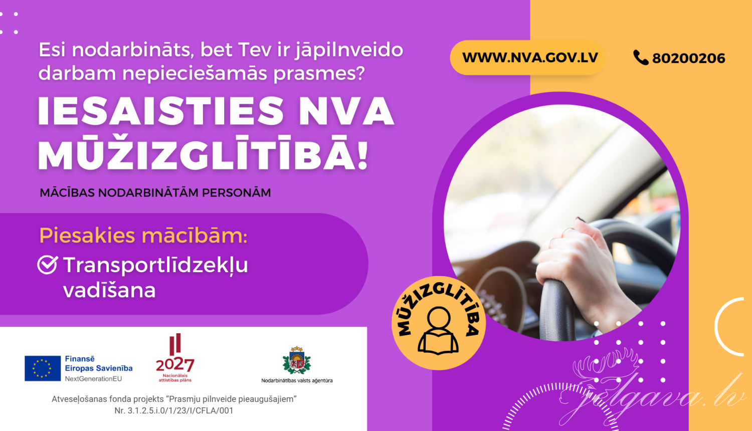 Lai veicinātu nodarbināto un pašnodarbināto personu konkurētspēju darba tirgū, piedāvājot zināšanu un prasmju nepārtrauktas pilnveidošanas iespējas, Nodarbinātības valsts aģentūra (NVA) šodien, 18. septembrī, uzsāk nodarbināto un pašnodarbināto personu papildu pieteikumu pieņemšanu transportlīdzekļu vadītāju izglītības programmu apguvei. Tā ir lieliska iespēja ar NVA atbalstu apgūt C, CE, C1E, D, DE vai D1E kategorijas autovadītāja mācību programmas.