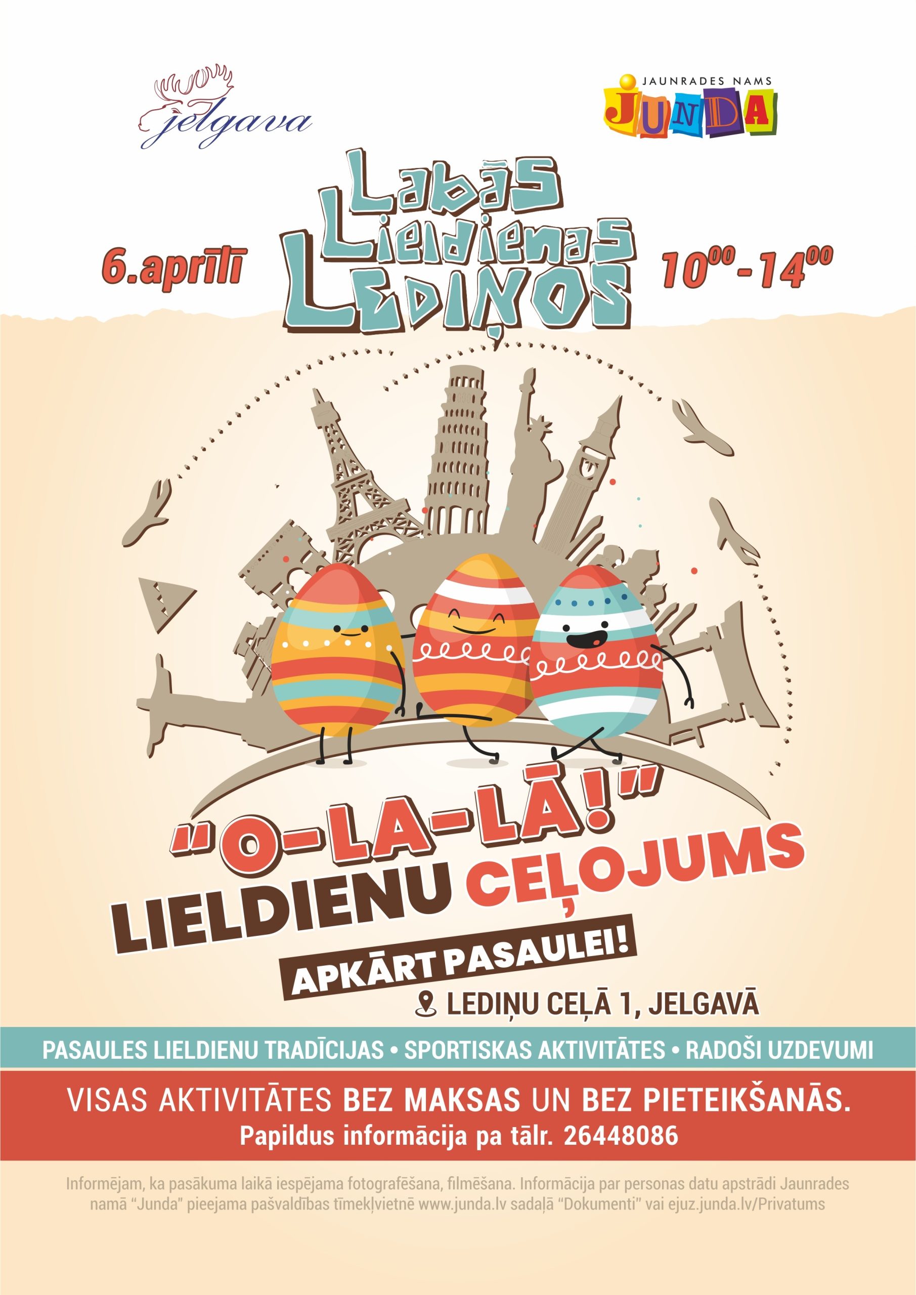 Otrajās Lieldienās, 6. aprīlī, no pulksten 10 līdz 14 Lediņos, Lediņu ceļā 1 ģimenes un ikviens interesents aicināts apmeklēt pasākumu “Labās Lieldienas Lediņos”. Apmeklētājus sagaidīs Lieldienu ceļojums apkārt pasaulei “O-LA-LĀ!” – ar kustību, radošumu un dažādu valstu Lieldienu tradīciju iepazīšanu.