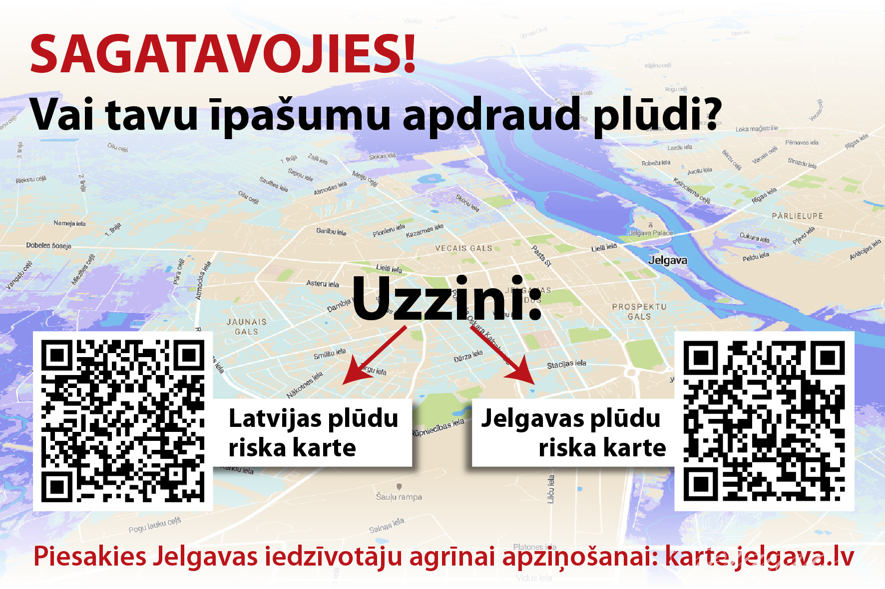 Iedzīvotāji aicināti iepazīties ar informāciju un pārliecināties, vai jūsu īpašumu apdraud plūdi. Ja īpašums atrodas plūdu apdraudētajā teritorijā, piesakies Jelgavas pilsētas iedzīvotāju agrīnai apziņošanai. To ērti var izdarīt vietnē karte.jelgava.lv sadaļā “Agrīnā apziņošana”.