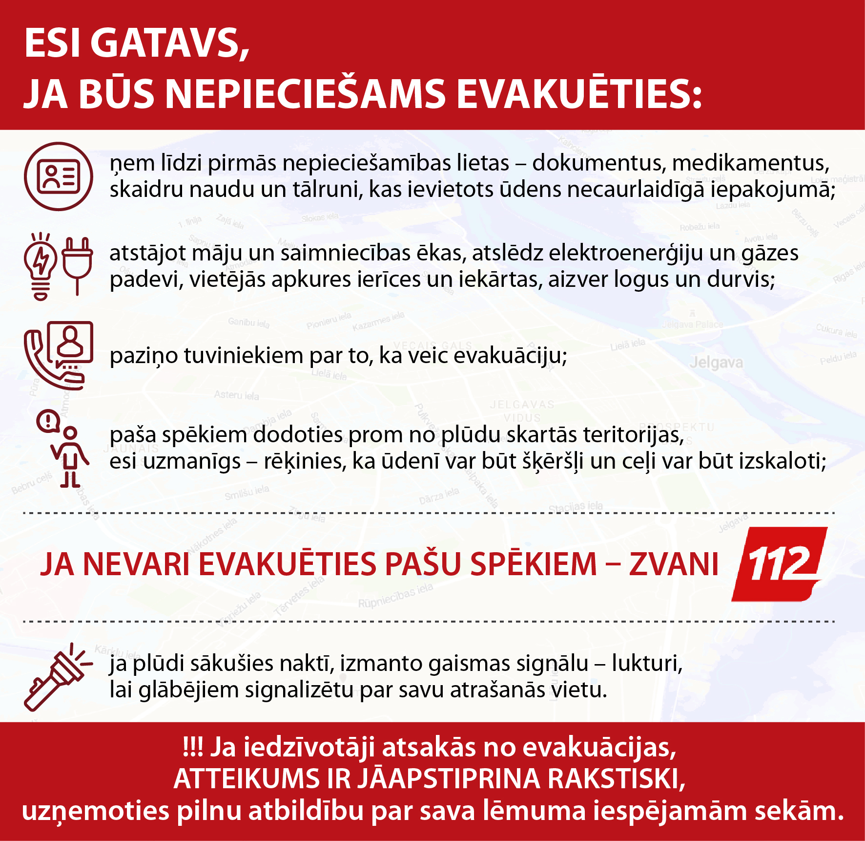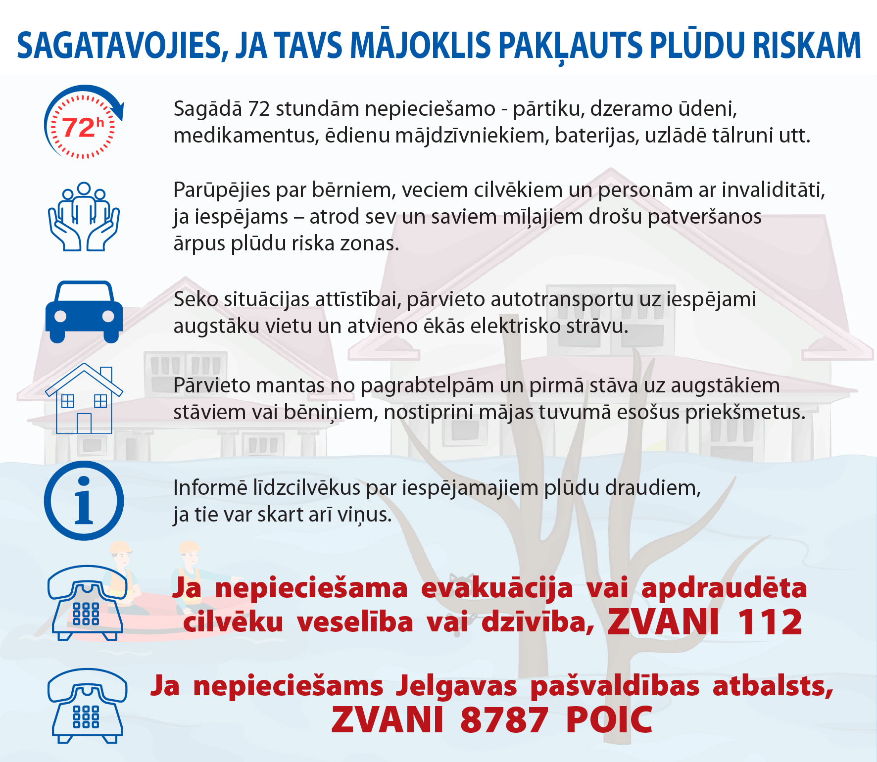 Prognozējot plūdu risku, Jelgavas valstspilsētas un Jelgavas novada sadarbības teritorijas civilās aizsardzības komisija uzdevusi tuvāko nedēļu laikā pastiprināti monitorēt ūdens līmeni upēs, apzinājusi pieejamos resursus un iespējamos scenārijus, lai plūdu gadījumā nekavējoties sniegtu palīdzību jelgavniekiem.