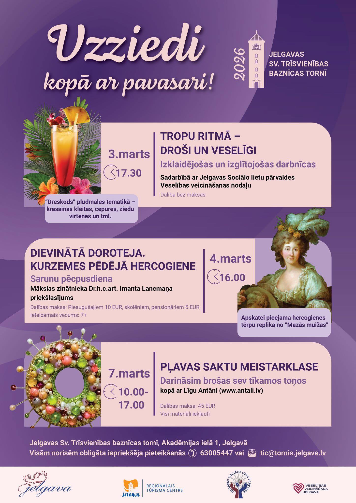 Jelgavas Sv. Trīsvienības baznīcas tornī (Tornis) jau tradicionāli, pavasara sezona iesākas ar pasākumu ciklu “Uzziedi kopā ar pavasari!”, kas veltīts Starptautiskajai sieviešu dienai. Šogad Jelgavas reģionālais tūrisma centrs aicina martā apmeklēt trīs tematiskus pasākumus, kuros akcentēts sieviešu radošums, pievilcības spēks un labsajūta ikdienā – izklaidējoši izglītojoša darbnīca “Tropu ritmā – droši un veselīgi”, sarunu pēcpusdiena ar izcilo Imantu Lancmani ”Dievinātā Doroteja. Kurzemes pēdējā hercogiene” un “Pļavas saktu” darināšanas meistarklase.