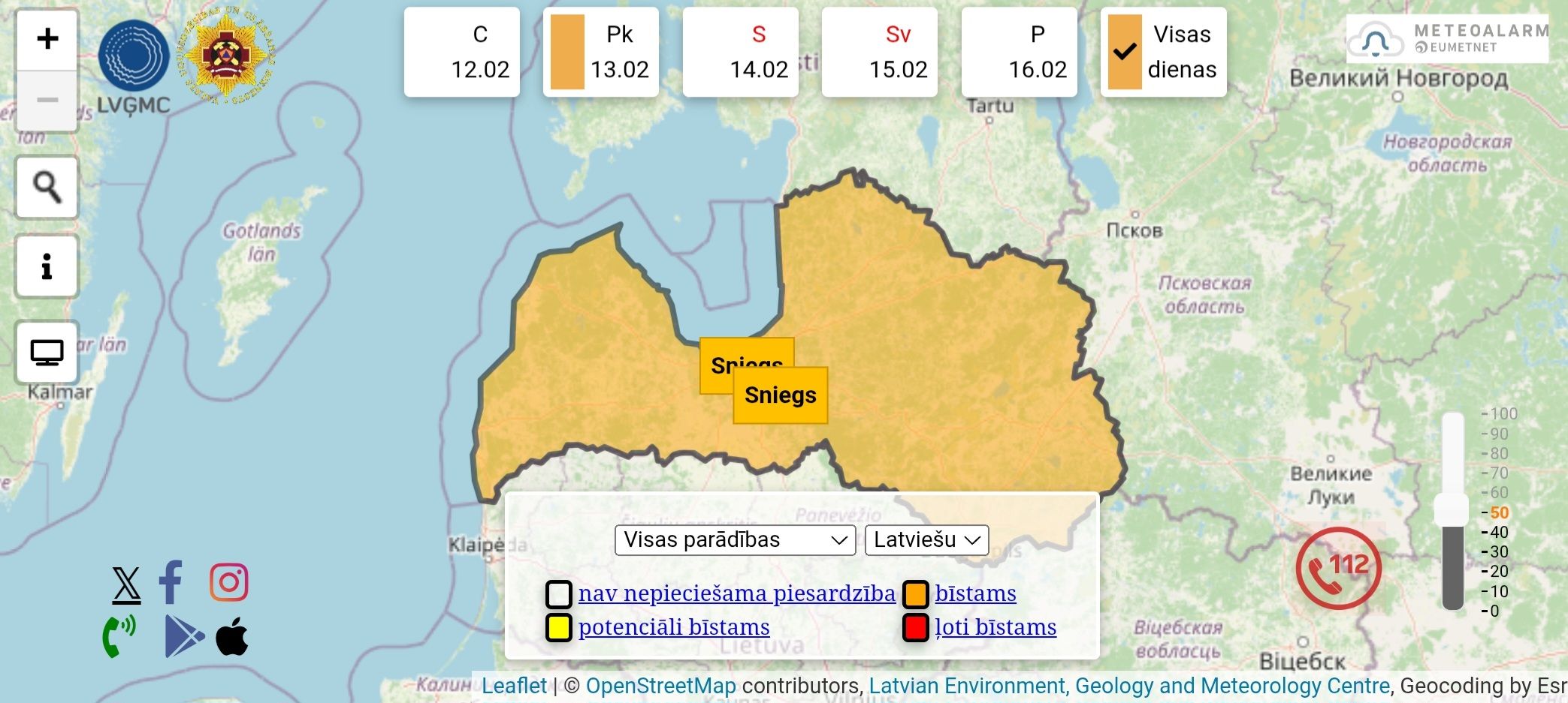 Latvijas Vides ģeoloģijas un metroloģijas centrs (LVĢMC) vietnē bridinajumi.meteo.lv izsludinājis oranžo sniega brīdinājumu – tas spēkā no 13. februāra pulksten 8 līdz 20. Ņem vērā, ka brīdinājuma pakāpē un laiks, izvērtējot situāciju un prognozes, var mainīties.
