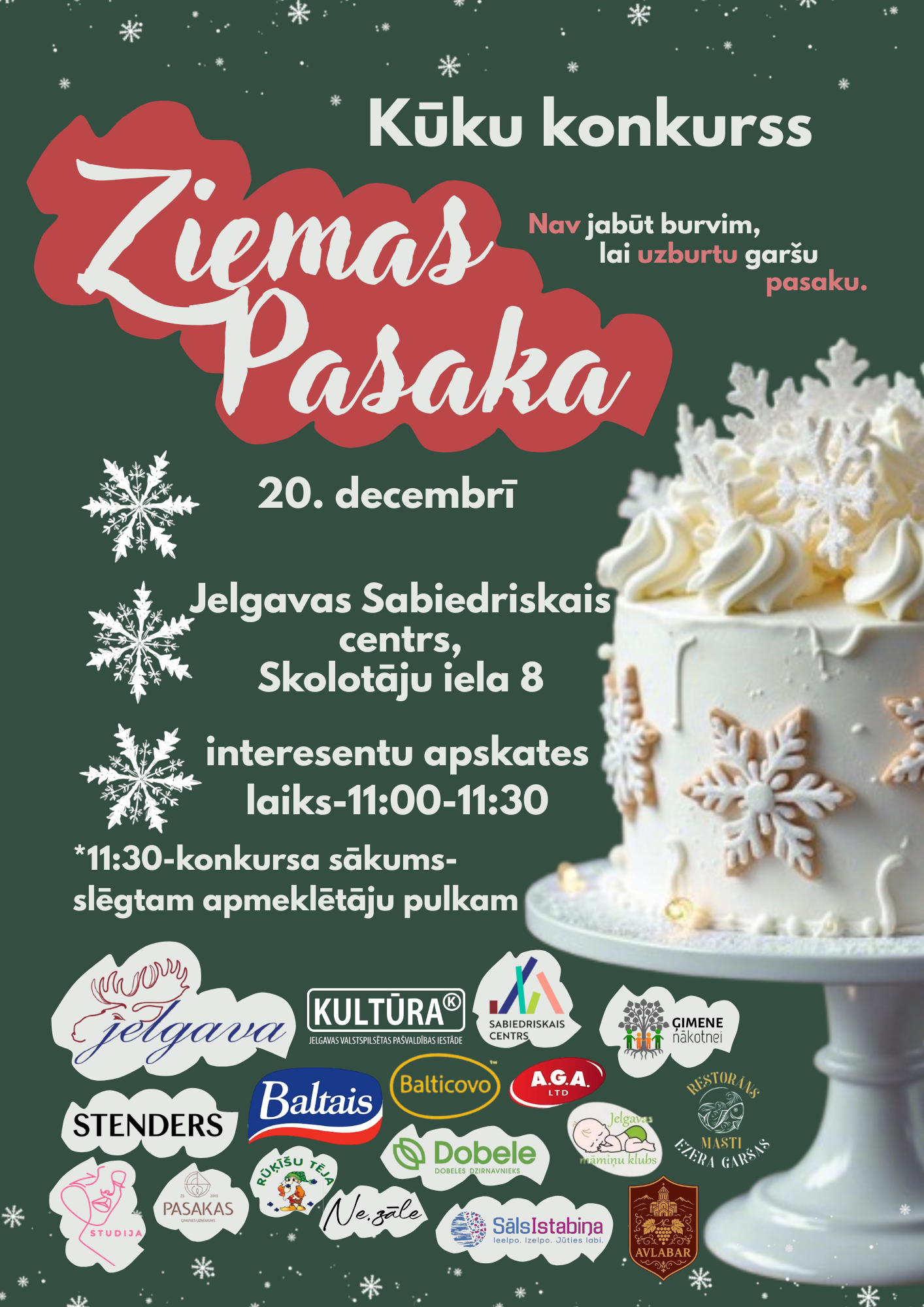 Jelgavas Sabiedriskajā centrā vienuviet savu meistarību demonstrēs gan jaunieši, kuriem kūku cepšana ir hobijs, gan pieredzējušas kūku cepējas, kurām kūku cepšana ir sirdslieta. Šajā konkursā kūku cepēji, veidojot kūkas dizainu un garšu, varēs brīvi izpausties, atbilstoši nosaukumam “Ziemas pasaka”, gatavojot saldu, sāļu, vai vegānu kūku.