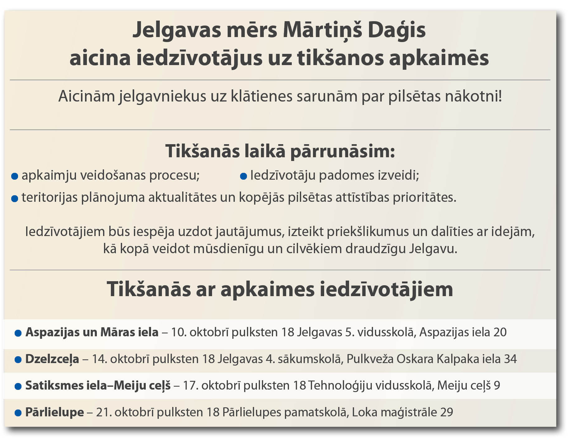 Otrdien, 7. oktobrī, Baltajā veikalā, Lietuvas šosejā, aizvadīta Jelgavas domes priekšsēdētāja Mārtiņa Daģa tikšanās ar Viskaļi–Romas krogs apkaimes iedzīvotājiem.