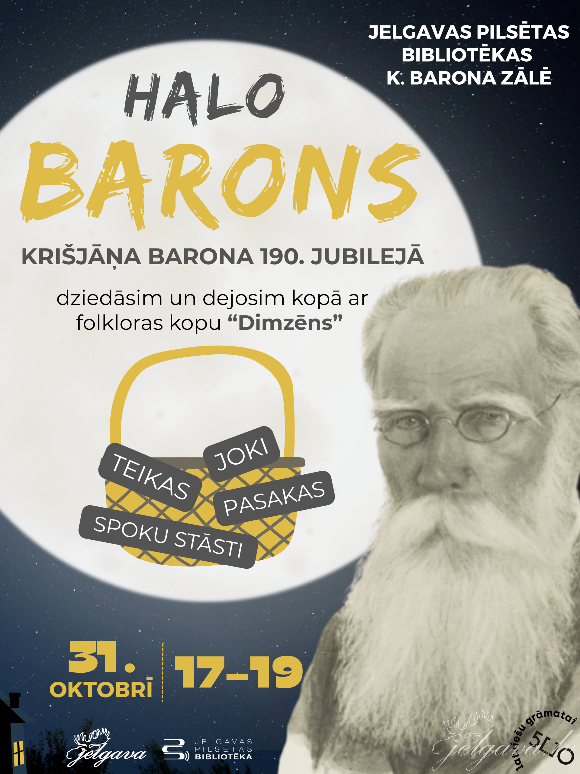 Godinot un stiprinot latviešu tradīcijas, 31. oktobrī – Krišjāņa Barona dzimšanas dienā– Jelgavas Pilsētas bibliotēkā no pulksten 17 līdz 19 pasākumā “Halobarons” tiks atzīmēta viņa 190. jubileja. Laipni aicināti visi interesenti!