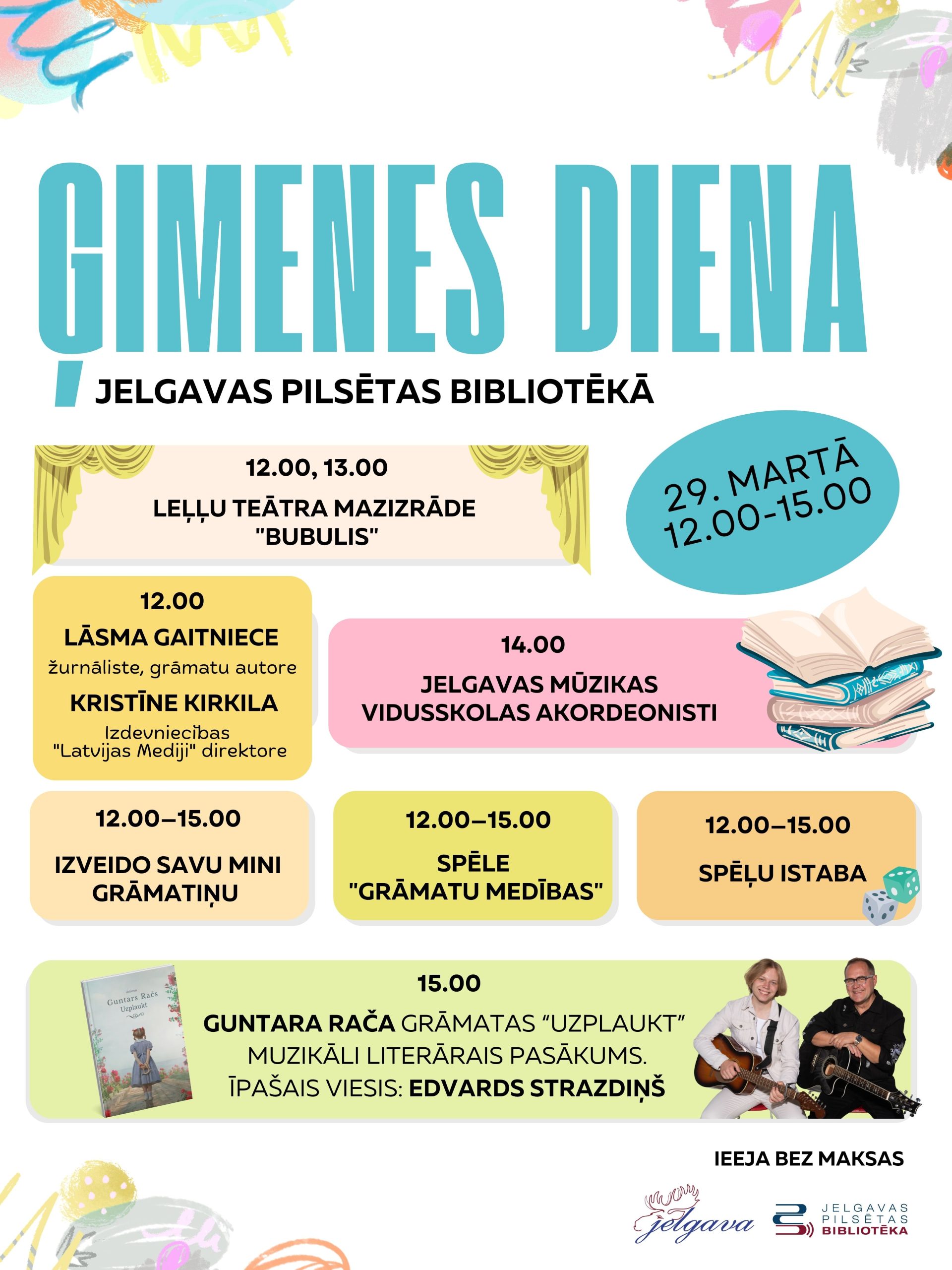29. martā no pulksten 12 līdz 15 Jelgavas Pilsētas bibliotēka Akadēmijas ielā 26 ielūdz uz Ģimenes dienu bibliotēkā. Apmeklētājus sagaida plaša programma gan pieaugušajiem, gan bērniem. Bibliotēkā notiks dažādas izzinošas un radošas aktivitātes, spēle “Grāmatu medības”, leļļu teātra mazizrāde “Bubulis”, darbosies spēļu istaba, varēs baudīt Jelgavas Mūzikas vidusskolas akordeonistu priekšnesumus, tikties ar žurnālisti un grāmatu autori Lāsmu Gaitnieci un izdevniecības “Latvijas mediji” direktori Kristīni Kirkilu, bet dienas kulminācijā – Guntara Rača grāmatas “Uzplaukt” muzikāli literārais pasākums kopā ar īpašo viesi mūziķi Edvardu Strazdiņu.