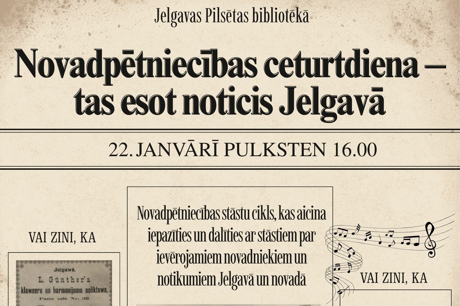 Jelgavas Pilsētas bibliotēka aicina uz jaunu sarunu ciklu “Novadpētniecības ceturtdienas – tas esot noticis Jelgavā”, kas turpmāk notiks reizi mēnesī un būs veltīts stāstiem par ievērojamiem novadniekiem un nozīmīgiem notikumiem Jelgavā un novadā. Pirmā tikšanās notiks 22. janvārī pulksten 16 Jelgavas Pilsētas bibliotēkā Akadēmijas ielā 26, un tā būs veltīta mūzikai.