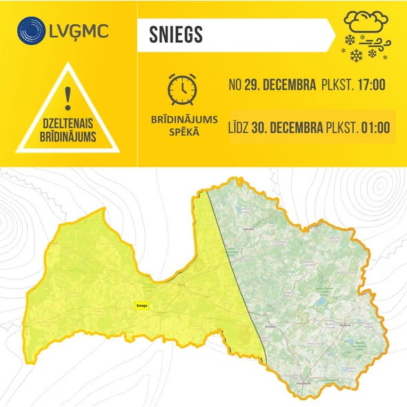 Latvijas Vides ģeoloģijas un meteoroloģijas centrs informē, ka pirmdienas, 29. decembra, vakarā vietām rietumu un centrālajos rajonos gaidāma stipra snigšana – veidosies 5-7 cm bieza sniega sega. Vēja ietekmē gaidāma arī putināšana un redzamības pasliktināšanās snigšanas laikā līdz 500-1000 m. Aicinām satiksmes dalībniekus būt uzmanīgiem – atsevišķi ceļu posmi būs slideni!