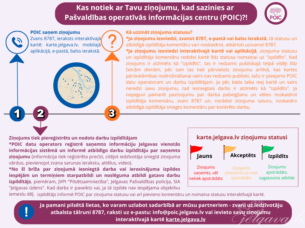 “POIC kontaktcentrs ir vieta, kur vienkopus saplūst iedzīvotāju ziņojumi par dažādām ar infrastruktūru saistītām un citām problēmām, kas tiek reģistrēti un nodoti atbildīgajiem darbu veicējiem, lai izslēgtu jebkādu iespēju, ka tie varētu pazust milzīgajā informācijas plūsmā. Iedzīvotājiem nav jāmeklē atsevišķas pašvaldības iestādes kontaktinformācija, zvans 8787 un mūsu datu operatori informāciju piereģistrēs, nodos to darbu veicējiem un vēlāk spēs sniegt arī atbildi par to kā risinās jautājuma virzība,” kārtību skaidro POIC vadītājs Elvis Meija, uzsverot, ka operatīva un saprotama komunikācija ir POIC kontaktcentra prioritāte, tāpēc ikviens ziņojums tiek apstrādāts ar atbildīgu attieksmi, izprotot iedzīvotāju emocionālo noskaņojumu, kas bieži vien ir jūtams ziņotāju balsīs. POIC datu operatori ir profesionāli un īpaši apmācīti informācijas aprites speciālisti, kuri uzklausīs, izjautās, atbalstīs ziņojuma pieteikšanas brīdī. “Mēs nevaram ietekmēt to cik ātri un, kā problēmu varēs atrisināt atbildīgie dienesti, bet garantējam, ka ziņotāji tiks uzklausīti un ziņojums sasniegs adresātu. Piemēram, jautājumos par pilsētas lietusūdens kanalizācijas sistēmām vai slidenām ielām, informāciju nododam pašvaldības iestādei “Pilsētsaimniecība”, jautājumos par ūdens piegādes pārtraukumiem sadarbojamies ar SIA “Jelgavas ūdens”, ziņojumus par sabiedriskās kārtības noteikumu neievērošanu tālāk nododam Jelgavas pašvaldības policijai utt.”, skaidro POIC vadītājs.