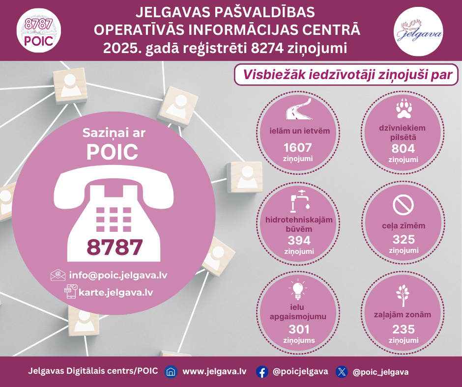 Jelgavas pašvaldības operatīvās informācijas centrā (POIC) 2025. gadā saņemti 8274 ziņojumi. Visbiežāk saziņā ar POIC izmantots iedzīvotāju atbalsta tālrunis 8787 – uz to saņemti 4272 zvani. Turpina pieaugt iedzīvotāju aktivitāte, iesniedzot pieteikumus, interaktīvajā kartē karte.jelgava.lv un mobilajā lietotnē “Jelgavas pilsēta”, kur saņemti 1429 ziņojumi, savukārt e-pasts info@poic.jelgava.lv lietots 291 ziņojuma iesniegšanai.
