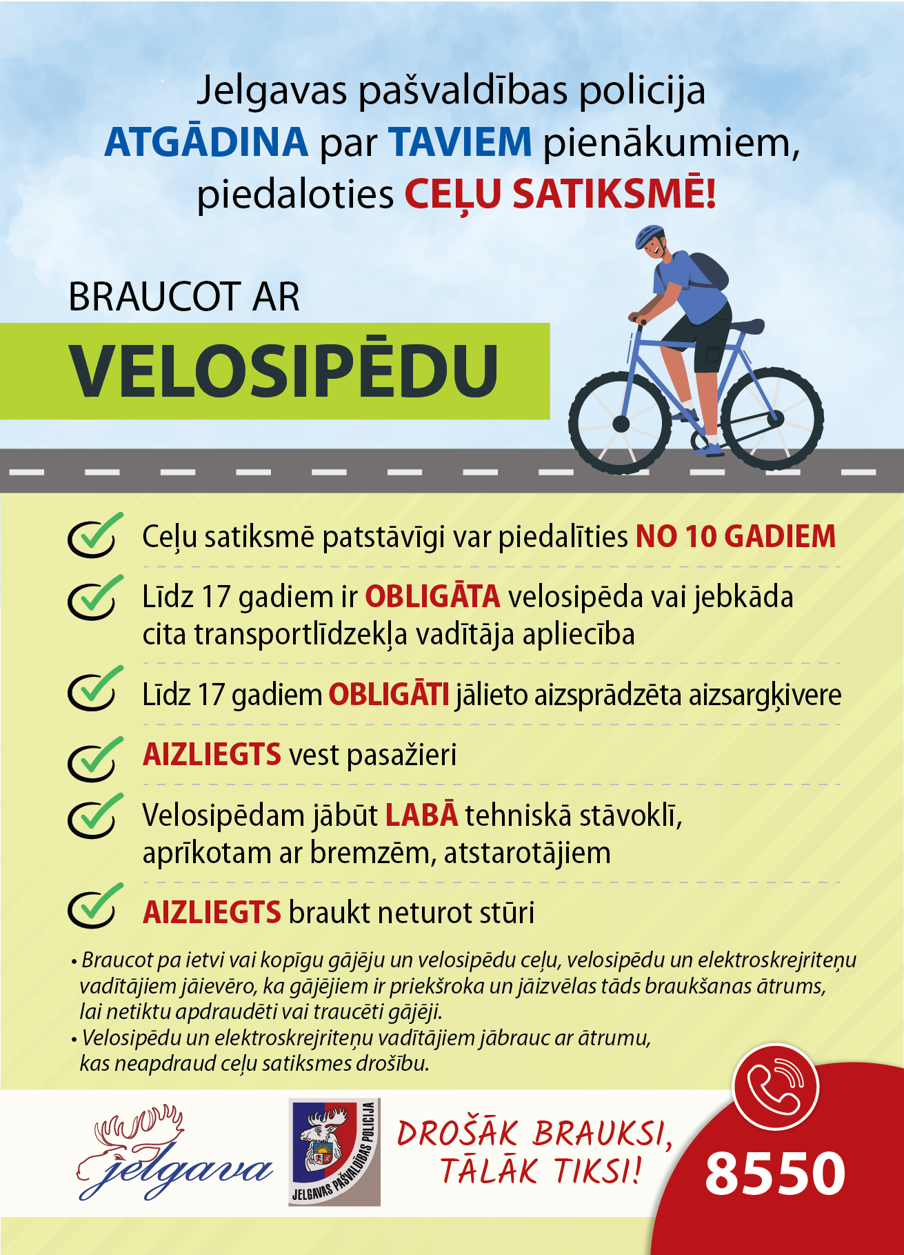 “Jāuzsver, ka vecāku pienākums ir rūpēties par savu bērnu drošību un nodrošināt, lai bērni ievēro noteiktās likuma prasības. Tādēļ atkārtoti aicinām vecākus pārrunāt ar saviem bērniem Ceļu satiksmes noteikumus un to prasības. Lūgums arī vecākiem nodrošināt, lai bērns, kurš ir sasniedzis 10 gadu vecumu, likumā noteiktā kārtībā iegūst velosipēda vadīšanas tiesības, kā arī obligāti lieto aizsargķiveri, piedaloties ceļu satiksmē ar velosipēdu vai elektroskrejriteni. Jelgavas pašvaldības policija saka paldies tiem bērniem un viņu vecākiem, kuri pret šo izturas atbildīgi,” tā policijas pārstāve Irina Matuseviča.