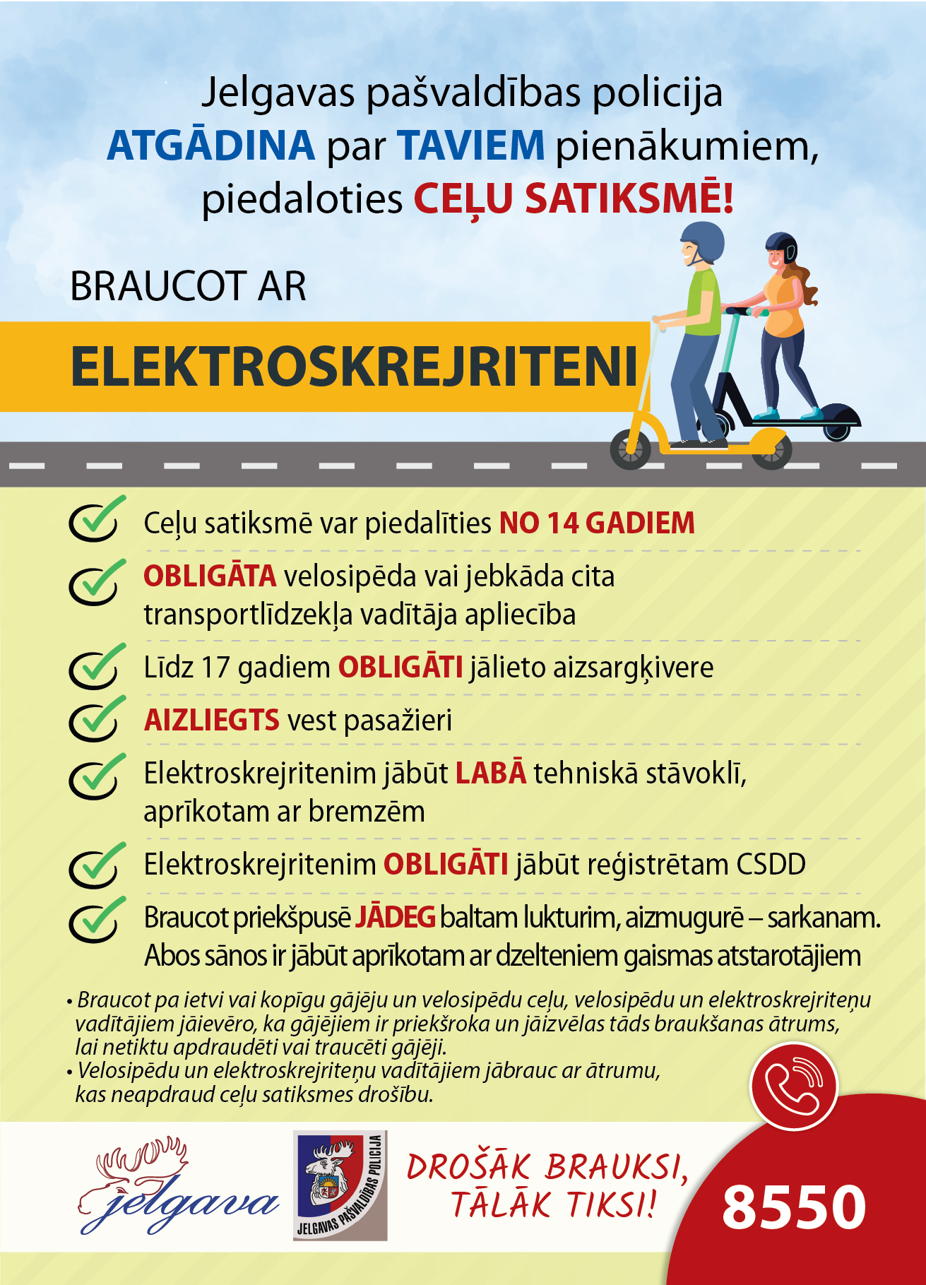 Jelgavas pašvaldības policijā atgādina, ka saskaņā ar Ceļu satiksmes likumu, elektroskrejriteņu reģistrācija ir obligāta un ceļu satiksmē atļauts piedalīties tikai ar reģistrētiem elektroskrejriteņiem, pie kuru konstrukcijas ir pielīmēta valsts reģistrācijas uzlīme. Ar elektroskrejriteni piedalīties satiksmē aizliegts personām, kuras nav sasniegušas 14 gadu vecumu. Savukārt personai vecumā no 14 gadiem braukt atļauts, ja tai ir velosipēda vai jebkuras kategorijas transportlīdzekļa vadīšanas tiesības.