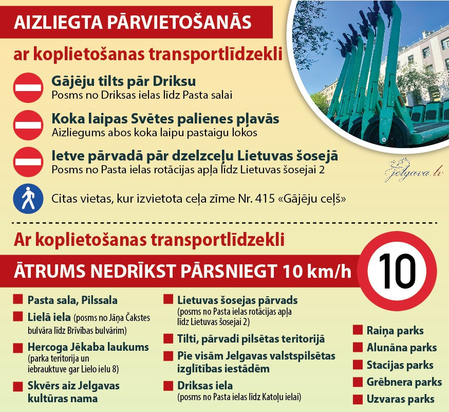 Iedzīvotājiem, kuri izmanto nomas transportlīdzekļus, jāņem vērā, ka Jelgavā ir noteikti skaidri ierobežojumi gan to novietošanai, gan ātrumam. Saskaņā ar pašvaldības saistošajiem noteikumiem Nr. 24-17 “Koplietošanas transportlīdzekļu izmantošanas saistošie noteikumi”, šos transportlīdzekļus aizliegts novietot uz tiltiem, satiksmes pārvadiem, velosipēdu ceļiem, gājēju ietvju vidū vai uz taktilā bruģakmens joslām. Tie nedrīkst traucēt gājēju un velosipēdistu pārvietošanos – pēc novietošanas jāatstāj vismaz 1,5 metrus plata brīva josla. Tāpat aizliegts tos novietot pilsētas apstādījumos, grāvjos, automašīnu stāvlaukumos, bērnu rotaļu laukumos, aktīvās atpūtas un sporta zonās, kā arī citās vietās, kas norādītas pašvaldības izveidotajā kartē tīmekļvietnē Jelgava.lv sadaļā “Pilsēta”/”Sabiedrība”/”Nomas skrejriteņu ierobežojumu zonas Jelgavā” ŠEIT.