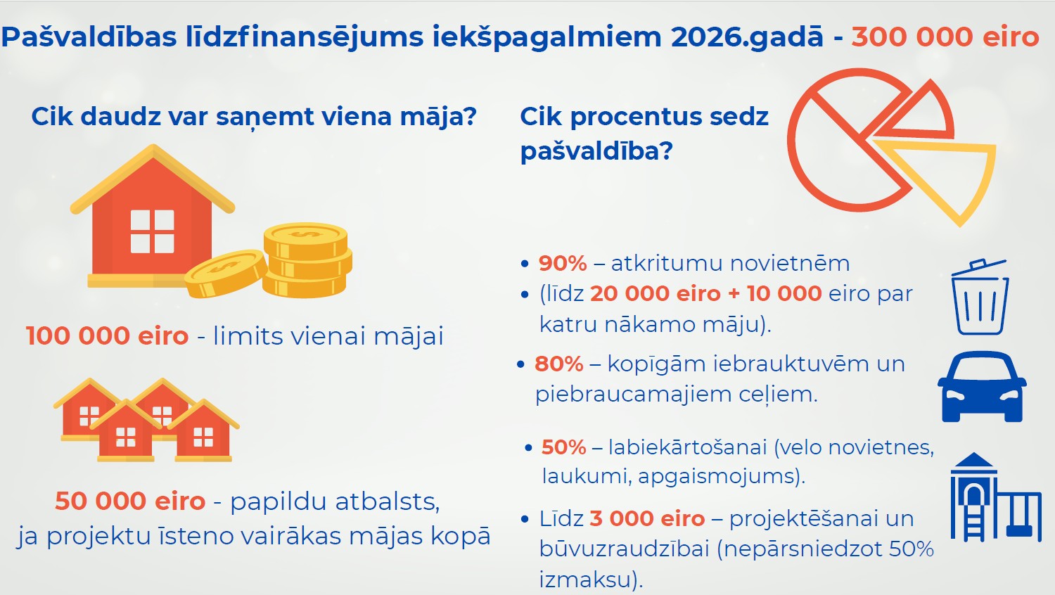Īpaši liels līdzfinansējuma apmērs paredzēts slēgta tipa atkritumu novietņu izbūvei – līdz 90% no attiecināmajām izmaksām. Ietvju un brauktuvju sakārtošanai iespējams saņemt līdz 80% līdzfinansējumu, ja plānotā brauktuve nodrošina piekļuvi vairākām daudzdzīvokļu mājām vai kopīgai atkritumu novietnei. Savukārt citiem labiekārtošanas darbiem, piemēram, bērnu rotaļu laukumu izbūvei, apgaismojuma uzstādīšanai vai stāvvietu ierīkošanai, saglabāts 50% pašvaldības līdzfinansējums.