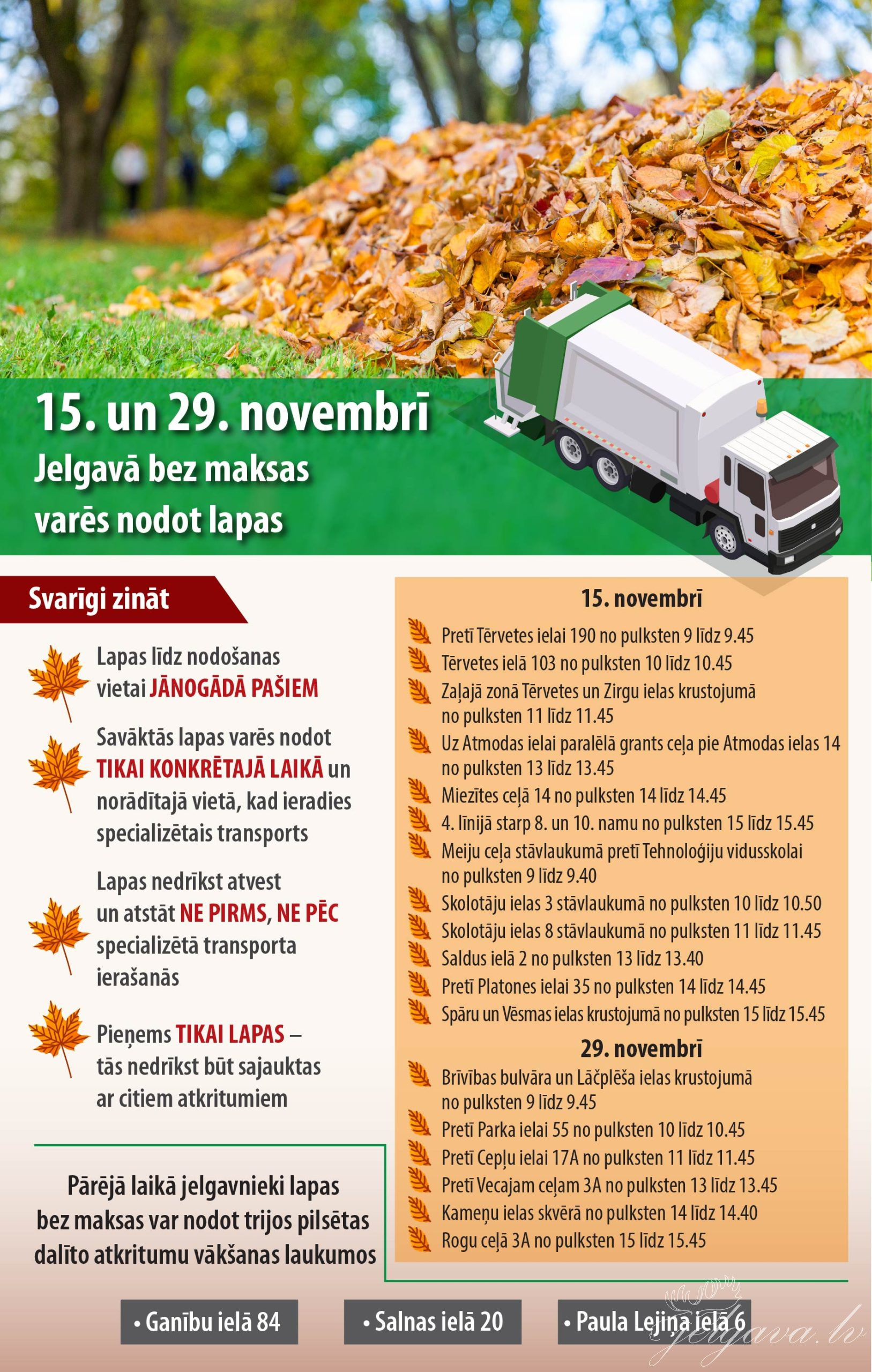 Šoruden divas dienas – 15. un 29. novembrī – vairākās vietās pilsētā iedzīvotājiem būs iespēja bez maksas nodot savāktās lapas. Lai to varētu izdarīt pēc iespējas tuvāk dzīvesvietai, katrā vietā noteiktā laikā ieradīsies pašvaldības organizēts specializētais transports. Citā laikā jelgavnieki lapas bez maksas tāpat kā līdz šim var nodot kādā no trim pilsētas dalīto atkritumu vākšanas (DAV) laukumiem.