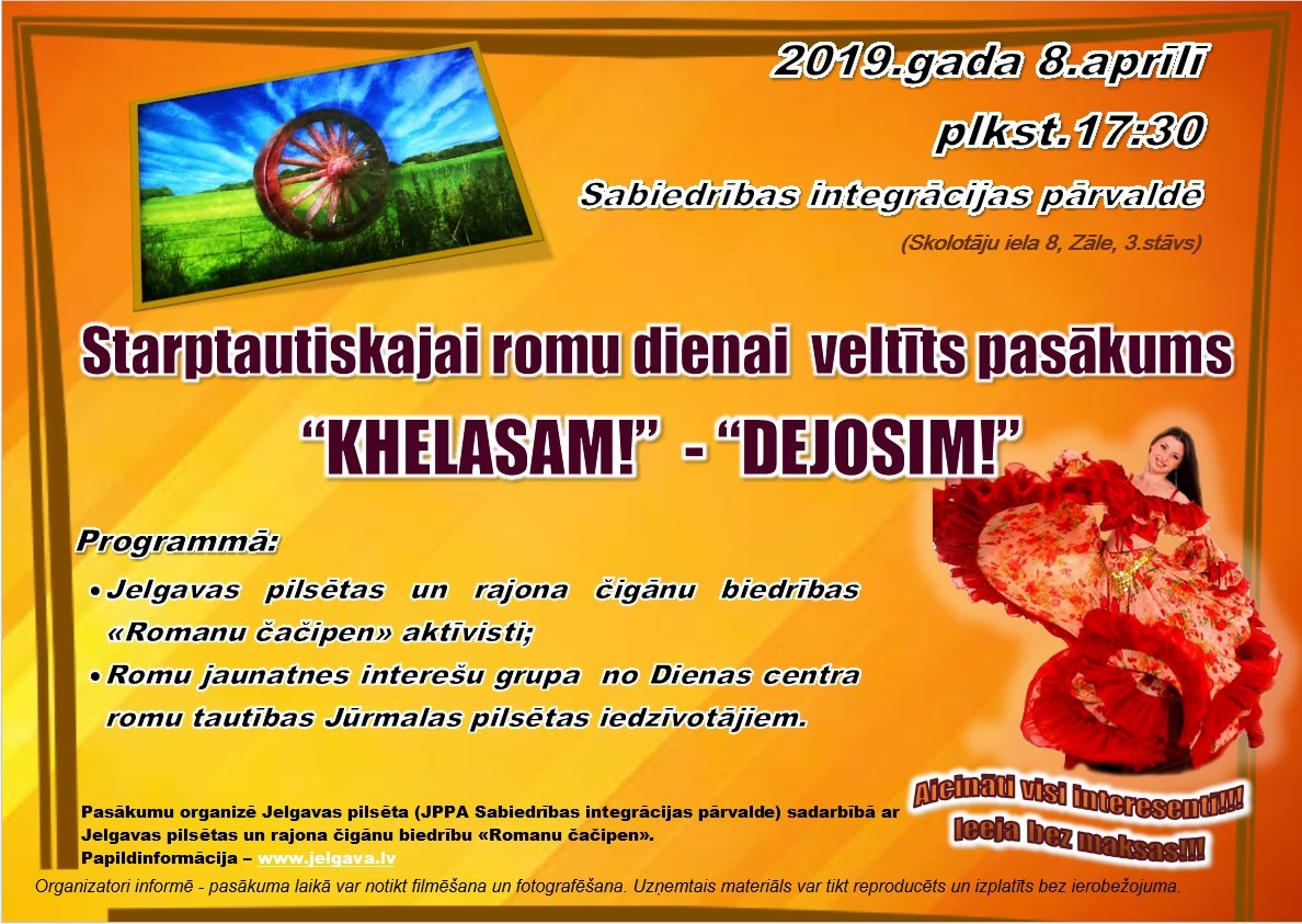 8.aprīlī, kad visā pasaulē atzīmē Starptautisko romu dienu interesenti aicināti uz Sabiedrības integrācijas pārvaldi, Skolotāju ielā 8, kur pulksten 17:30 norisināsies Starptautiskajai romu dienai veltīts pasākums – koncerts “Khelasam!” jeb “Dejosim!”.