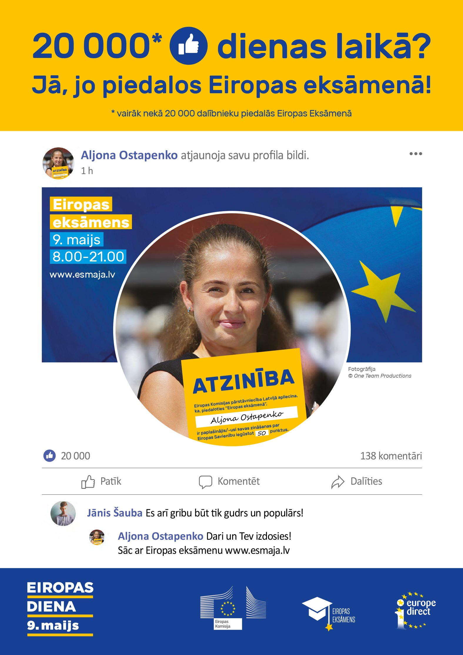 Latvijas iedzīvotāji jau 15 gadus aktīvi izmanto iespējas, ko sniedz Latvijas dalība Eiropas Savienībā – paplašinājušās ceļošanas un studiju iespējas, tiek saņemts plašs atbalsts uzņēmējdarbības attīstībai, uzlabojas vides un dzīves kvalitāte. Nozīmīgi ir izprast, ka ikviens no mums ir aktīvs un atbildīgs Latvijas un Eiropas līdzveidotājs – zinošs, kritiski domājošs un drosmīgs.