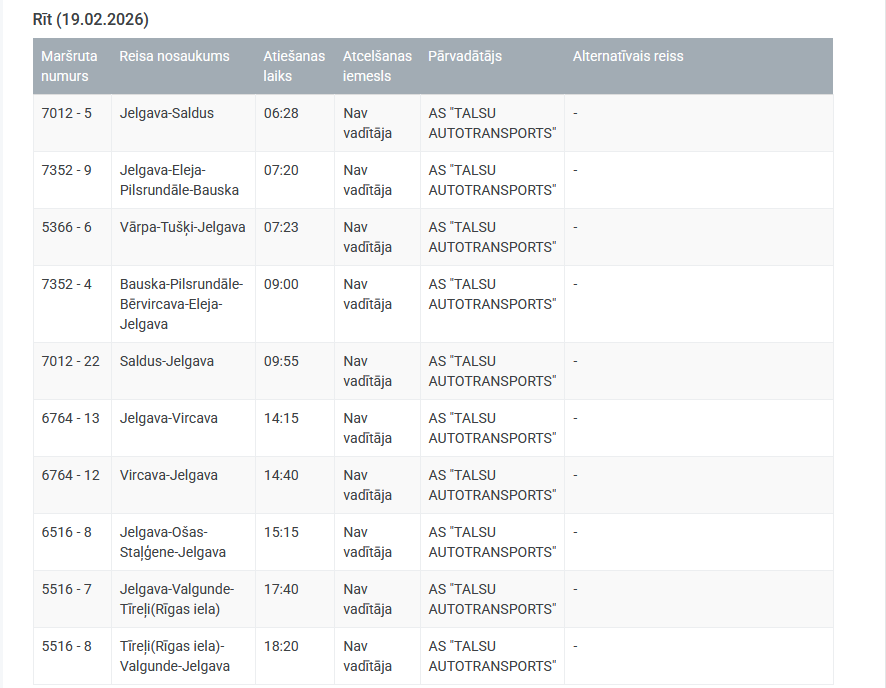 AS “Talsu autotransports” šoferu trūkuma dēļ ceturtdien, 19. februārī, ir atcēlusi kopumā desmit autobusu reisus Jelgavas virzienā, liecina informācija Autotransporta direkcijas mājaslapā.