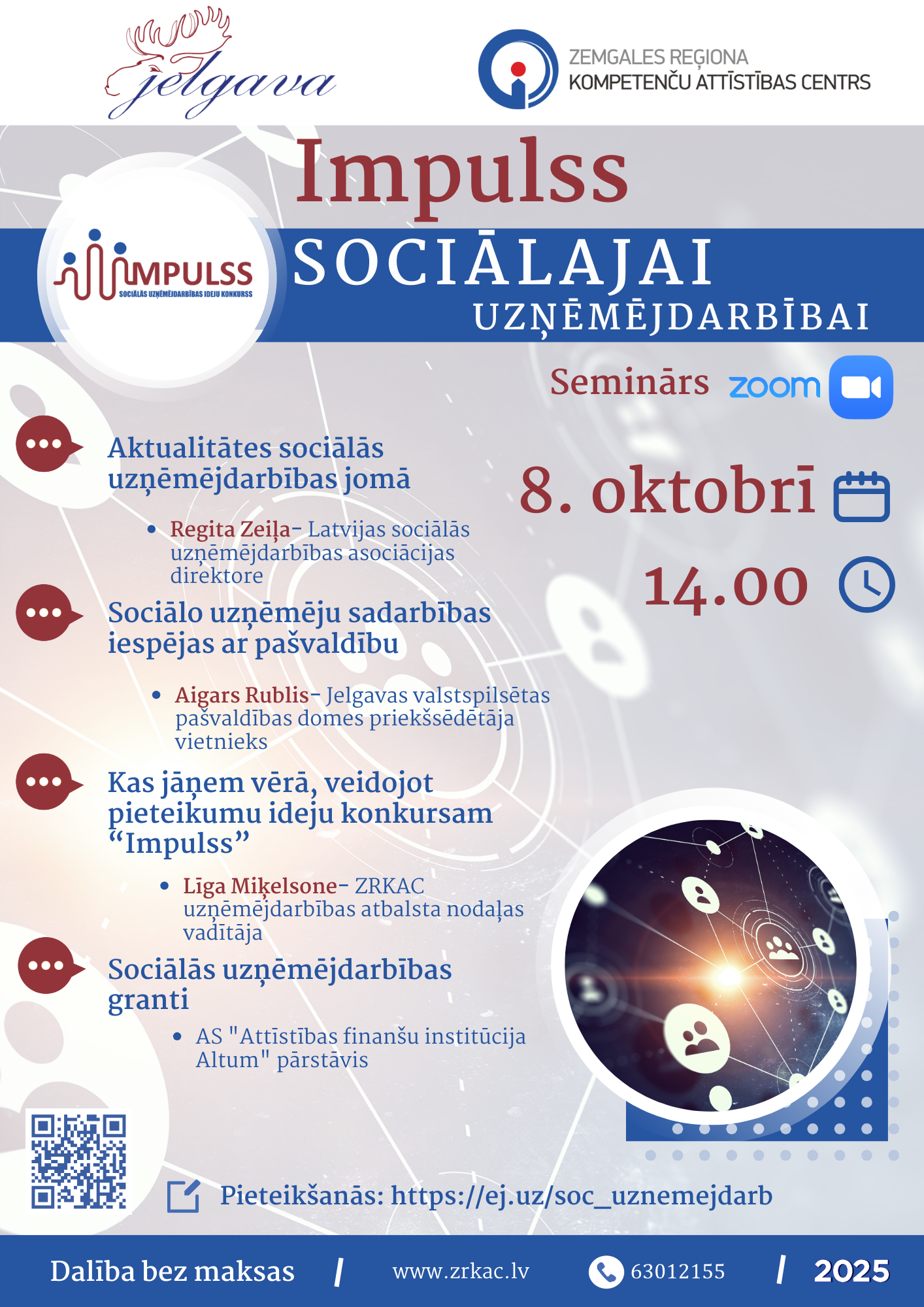 8. oktobrī pulksten 14 tiešsaistē “Zoom” platformā norisināsies seminārs “Impulss sociālajai uzņēmējdarbībai”, ko organizē Zemgales reģiona Kompetenču attīstības centrs (ZRKAC). Tā mērķis ir iepazīstināt ar aktualitātēm un finanšu atbalsta iespējām sociālās uzņēmējdarbības jomā, pašvaldības un sociālo uzņēmēju sadarbības iespējām, kā arī sniegt praktiskus ieteikumus ideju konkursa “Impulss” pieteikumu sagatavošanai.